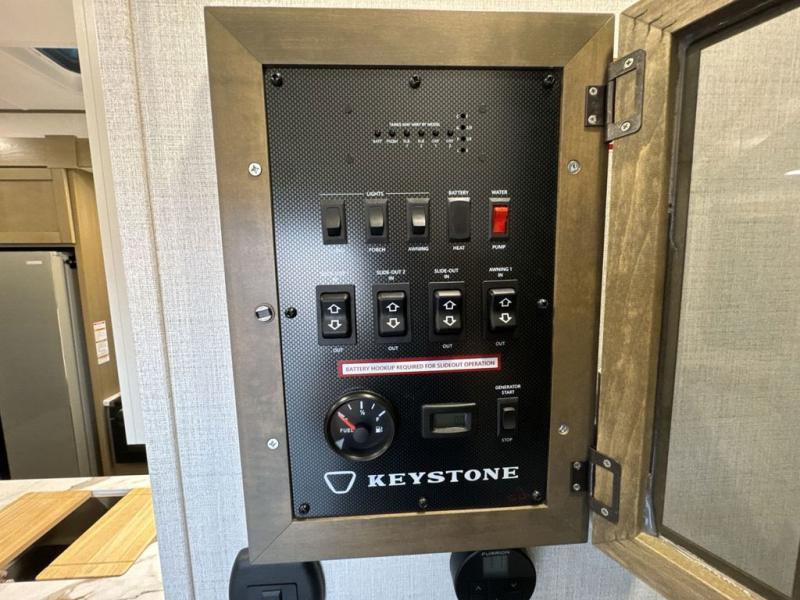 Embrace the great outdoors with a Fuzion Impact Edition toy hauler by Keystone! There are laminated fiberglass sidewalls and a 8' 4" wide-body construction for your toys and gear! The one-piece polypropylene heated underbelly includes enclosed tanks and valves which will help extend your camping season, and the leaf spring suspension system will provide smooth towing. Head inside to enjoy night shades, hardwood cabinetry, and fiberglass backed linoleum floor with no carpet for easy cleaning. Each model also includes a Girard on-demand water heater, two 30 lb. LP tanks, recessed LED puck lighting throughout, and the list of comforts goes on!