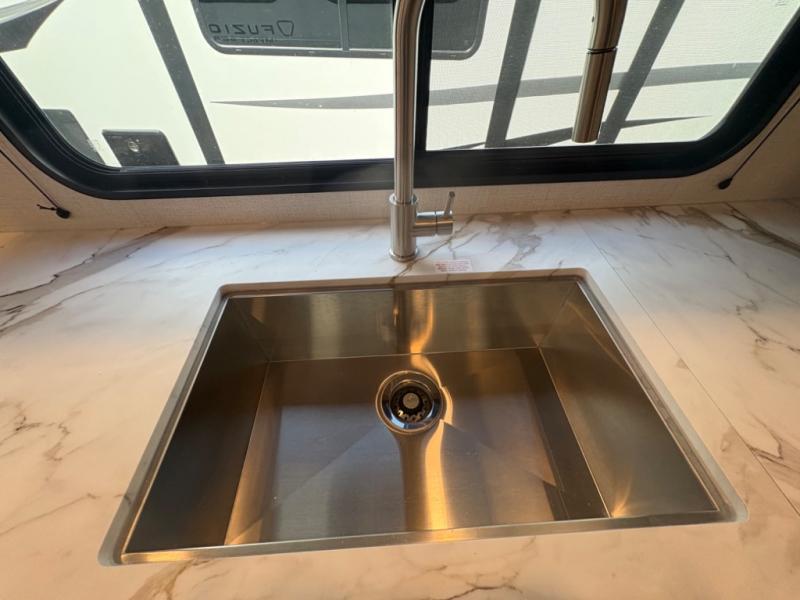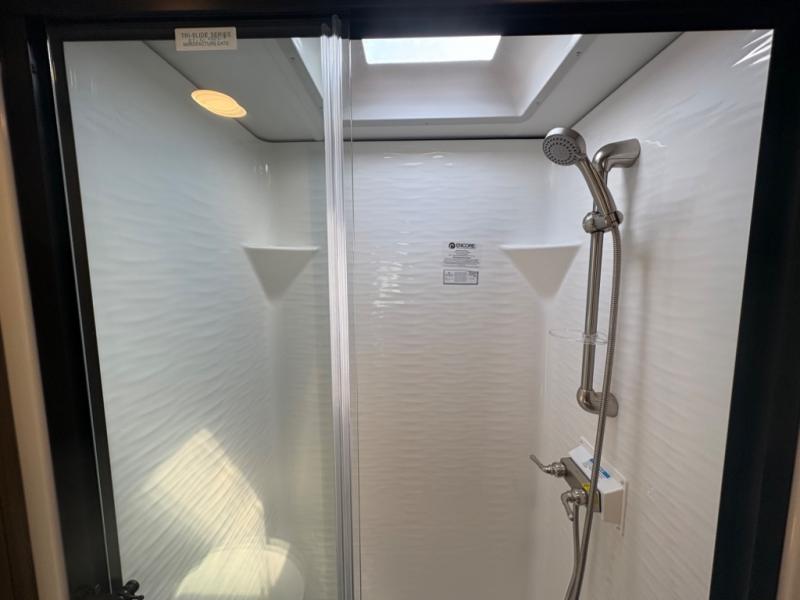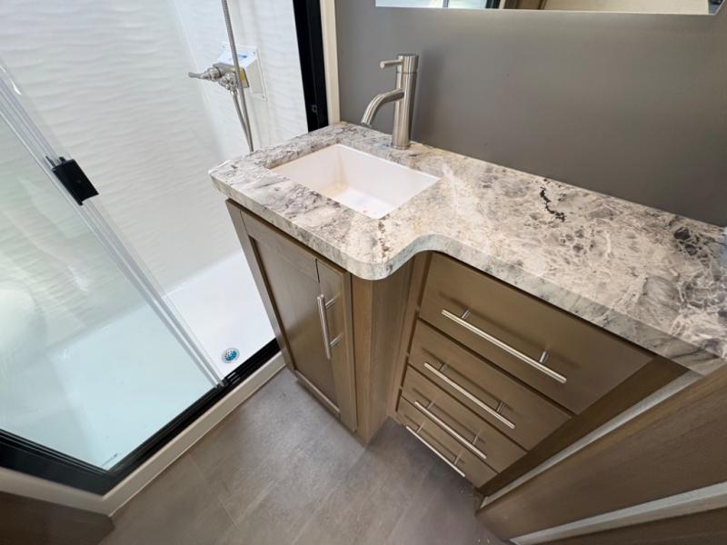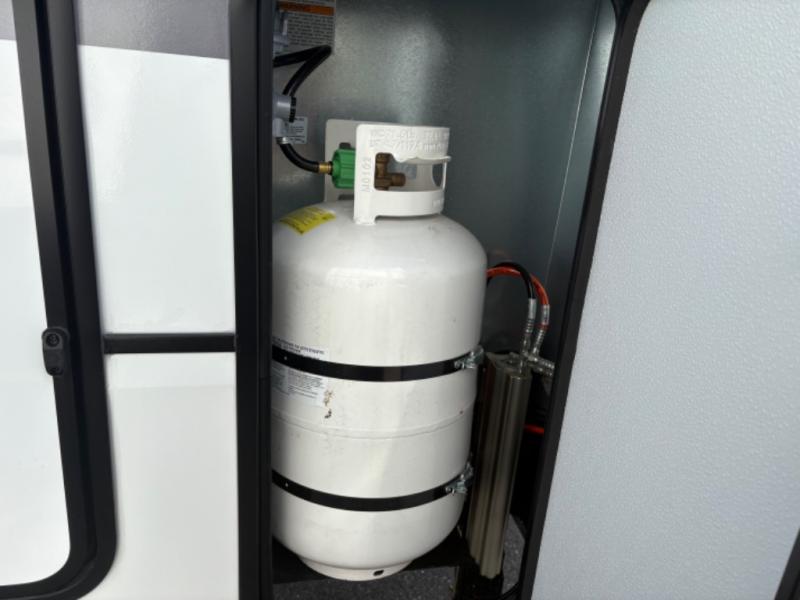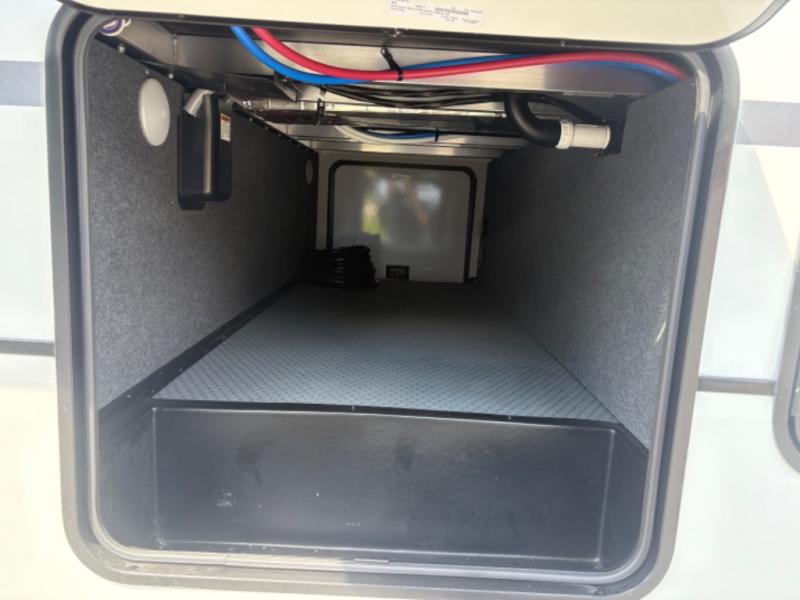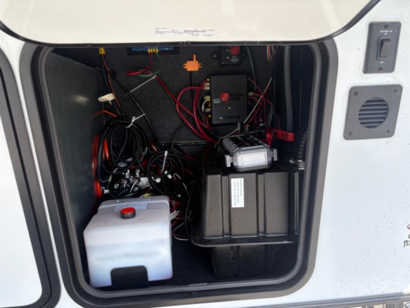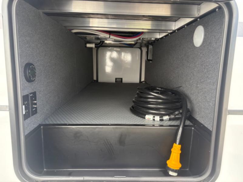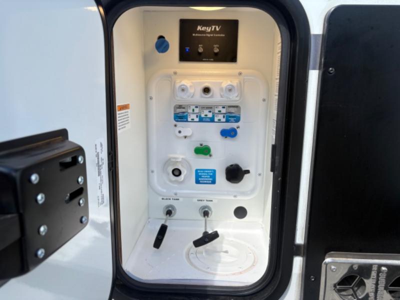 Hard-wired tie-downs, fuel station (30gal with pump), exterior shower, and a power awning with auto-dump and LED lighting