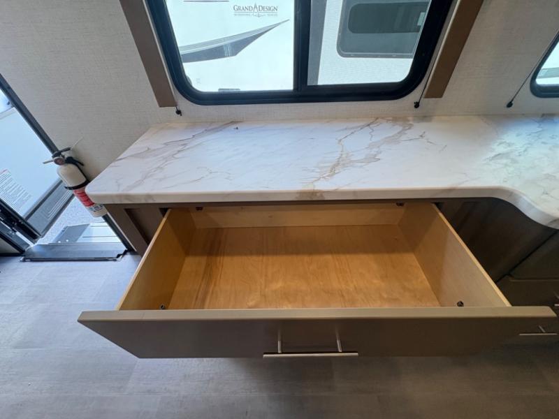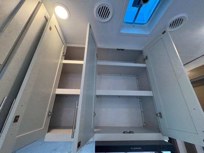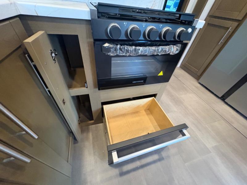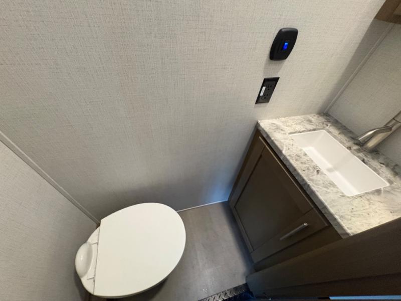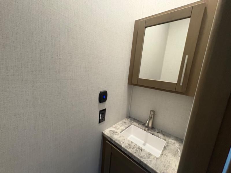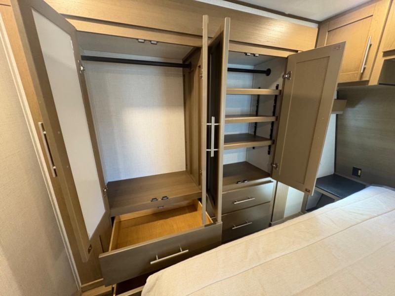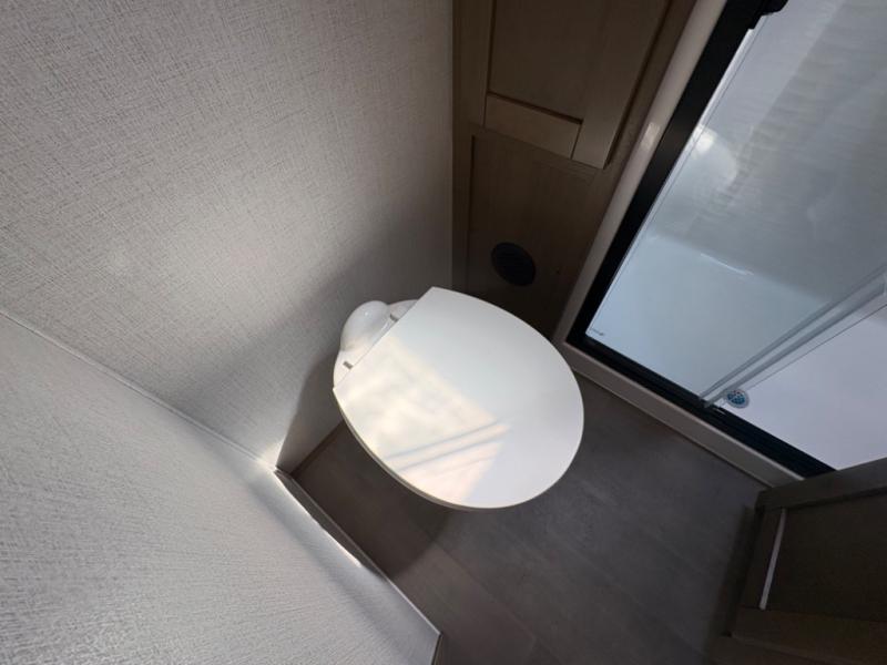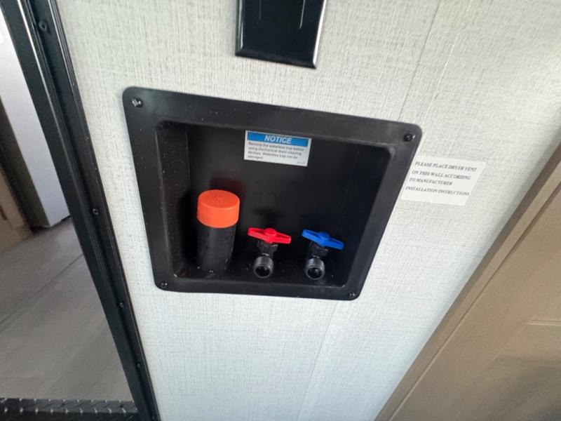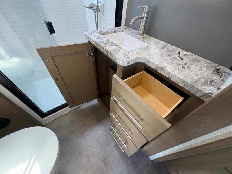 Hard-wired tie-downs, fuel station (30gal with pump), exterior shower, and a power awning with auto-dump and LED lighting