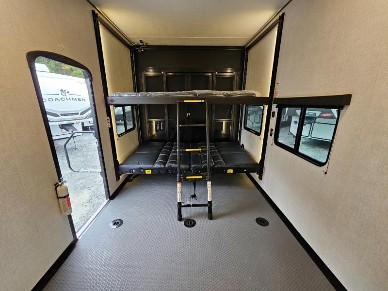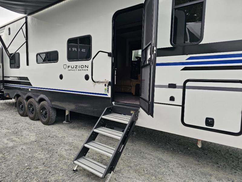 The Fuzion Impact Edition 416 delivers the perfect balance of rugged toy-hauling capability and residential comfort. With a massive 15' separate garage, a bath and a half, and versatile sleeping for up to eight, this fifth wheel toy hauler is ready for your most exciting adventures—whether it’s off-road weekends or extended trips.