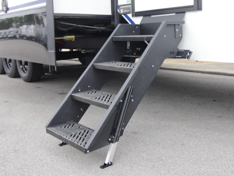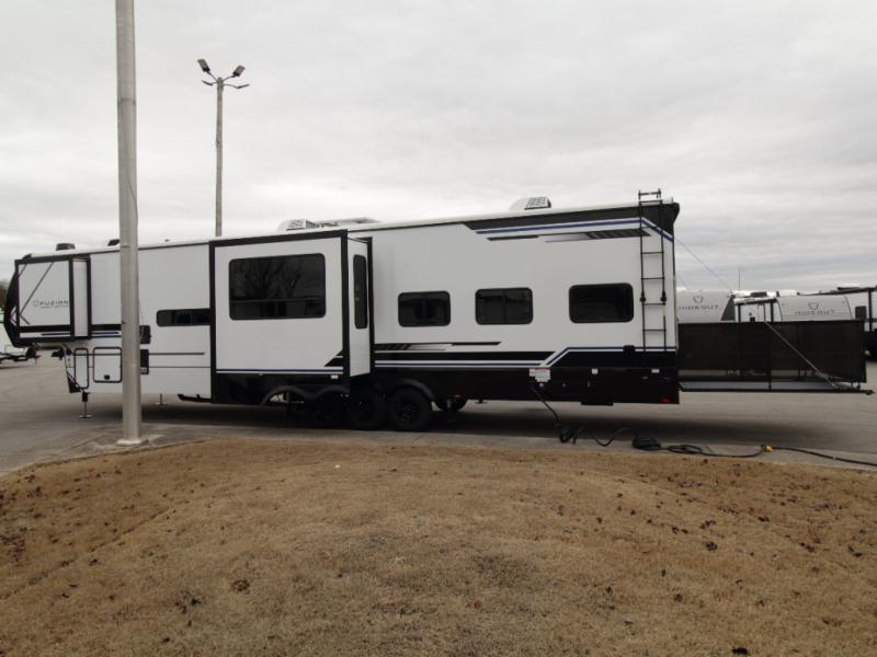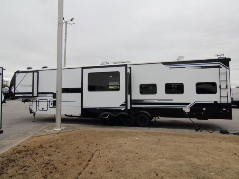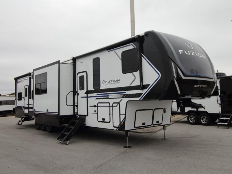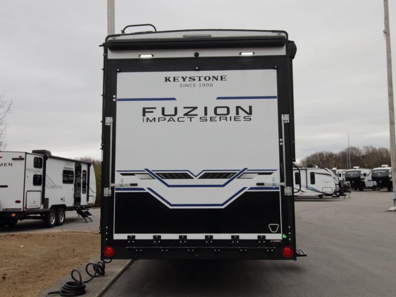Adventure meets comfort in the Keystone Fuzion Impact Edition 418 toy hauler, designed to handle your toys while providing residential-style living at the campground. Triple slide-outs create an open and inviting interior, making this model ideal for extended stays or large groups.