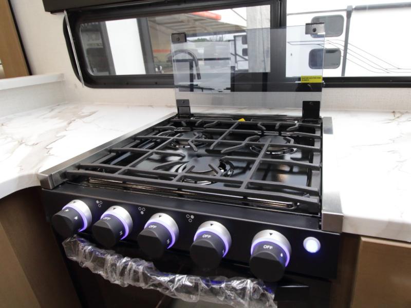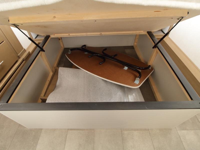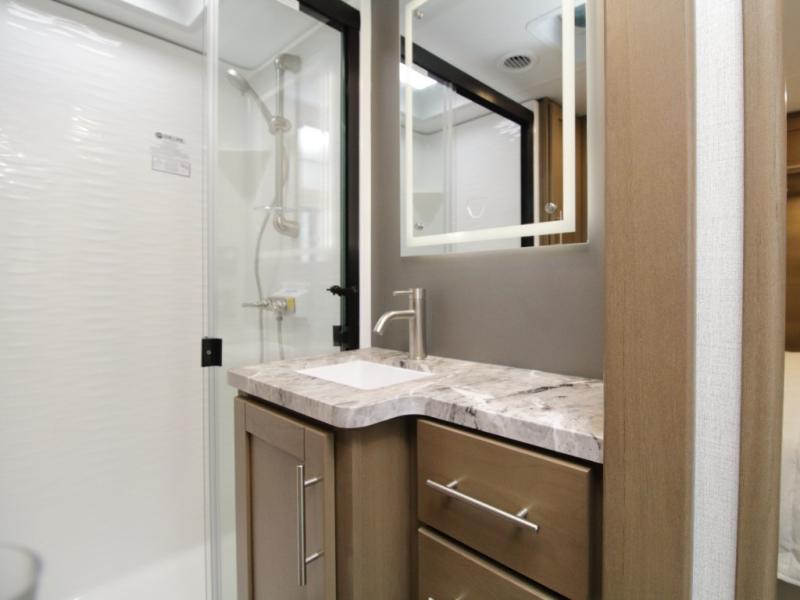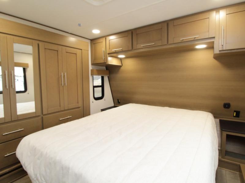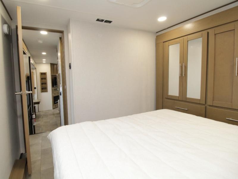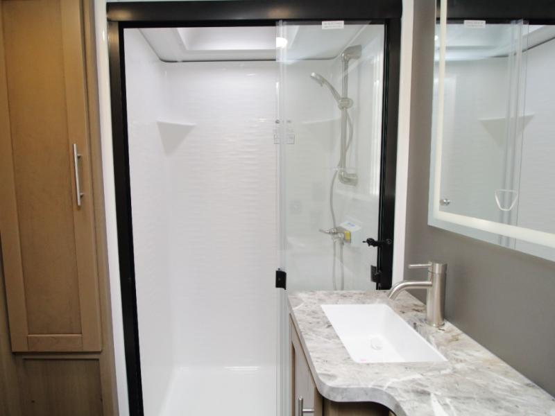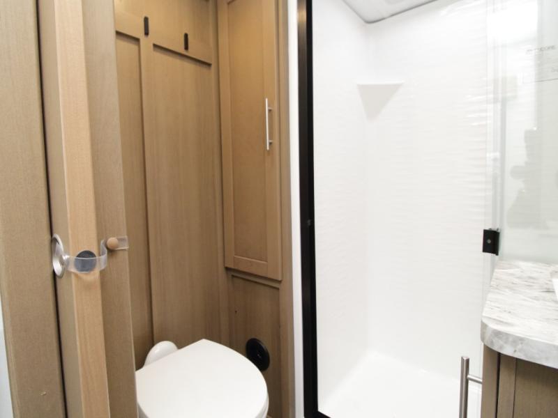 The full bathroom allows you to skip campground facilities, while the front private bedroom offers a peaceful retreat with a 60" x 74" queen bed, a slide-out wardrobe closet, and plenty of storage space.