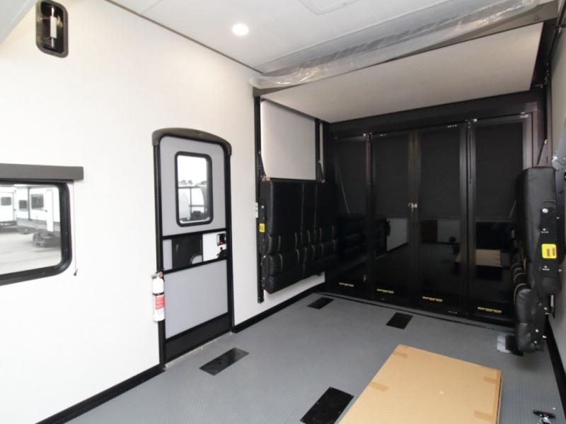 Experience ultimate adventure with the Keystone Fuzion Impact Edition 418, featuring a spacious 15' garage with a loft and a luxurious living area complete with an entertainment center and fireplace.
