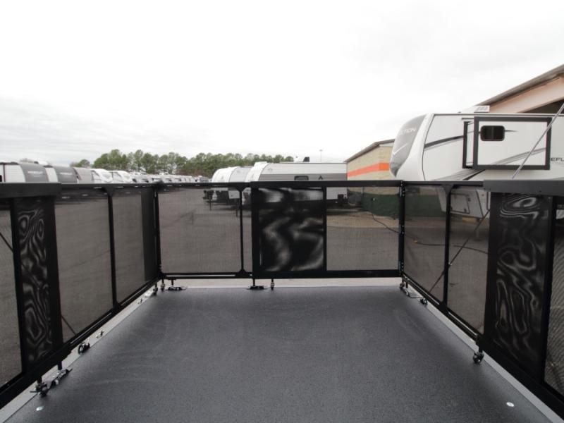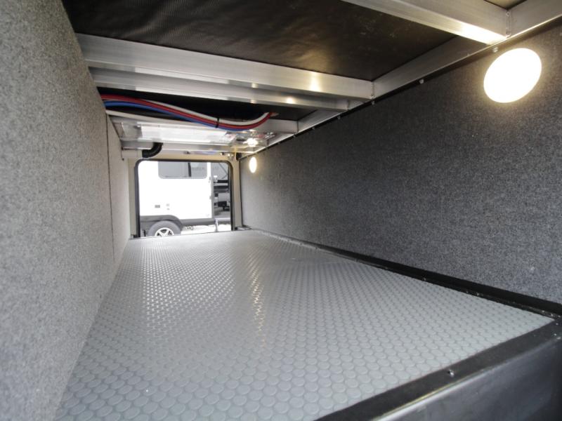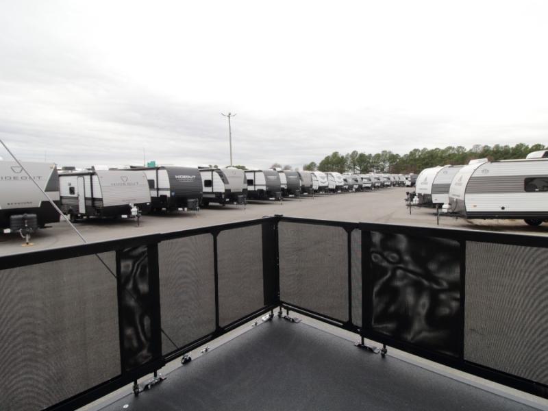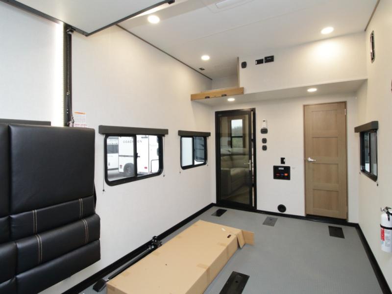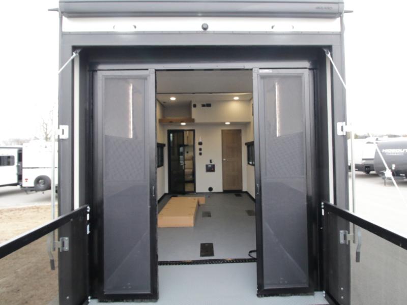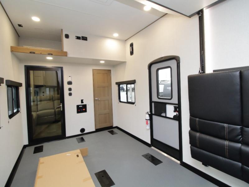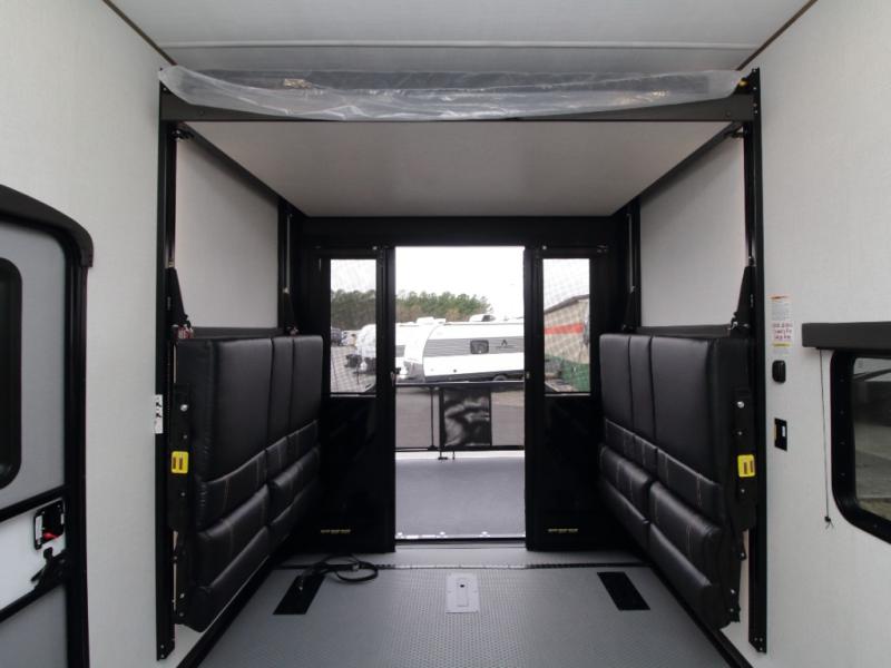 The 15-foot separate garage is packed with versatility, featuring dual opposing sofas with a power queen bed above, a loft with bunk mat, an 8-foot ramp door, and a convenient half bath. With heavy-duty 5,000 lb. tie-downs, you can confidently bring along ATVs, motorcycles, or other gear.