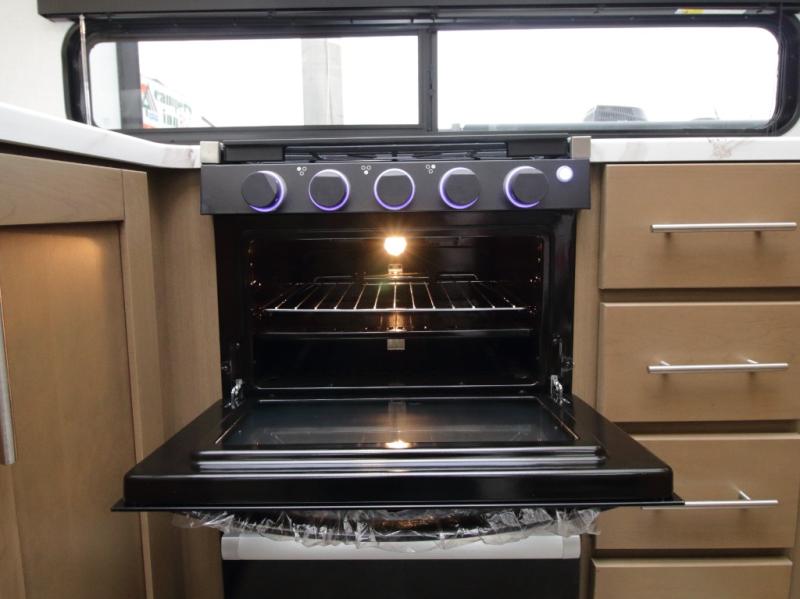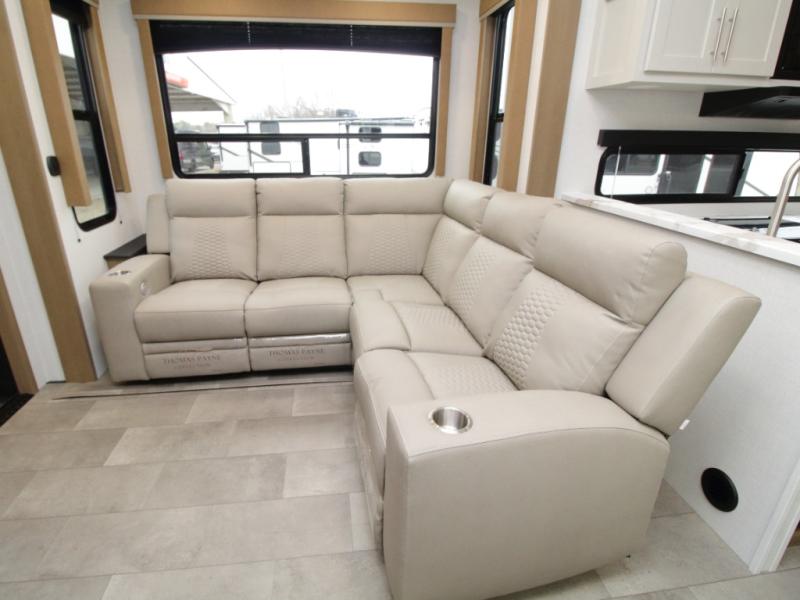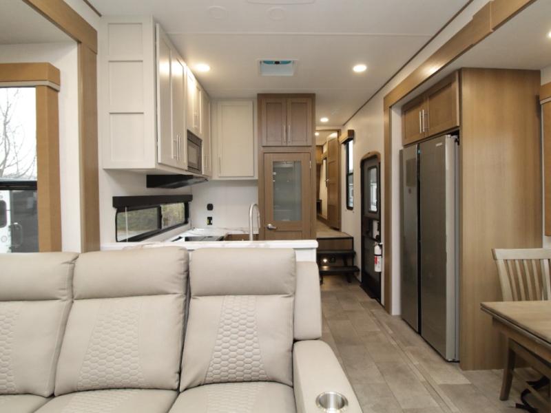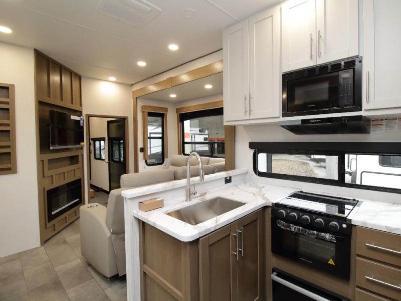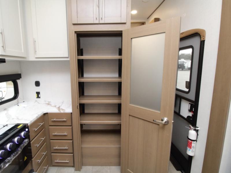 Inside the main living area, relax on the L-shaped sofa positioned across from the entertainment center with a fireplace—perfect for evenings indoors. The well-designed kitchen includes a U-shaped countertop for meal prep, a large pantry, a 12V refrigerator, and a dinette with free-standing chairs for comfortable dining.