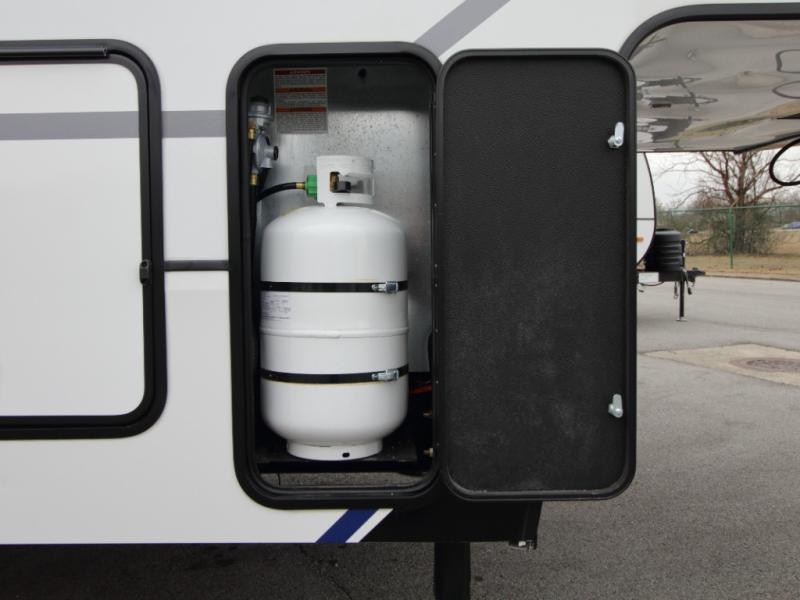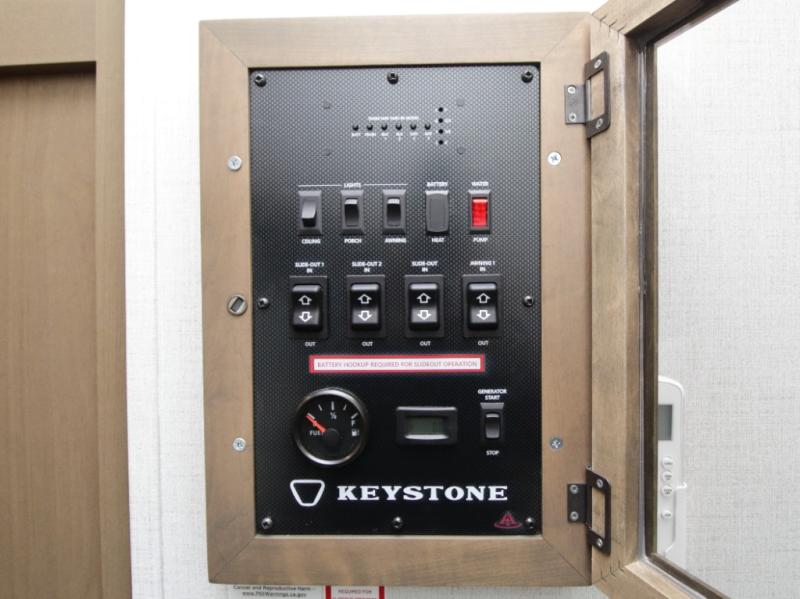 Interior features include hardwood cabinetry, night shades, recessed LED puck lighting, and fiberglass-backed linoleum flooring with no carpet for easy maintenance. Added conveniences like a Girard on-demand water heater, dual 30 lb. LP tanks, and quality Keystone construction make this toy hauler ready for wherever the road leads.