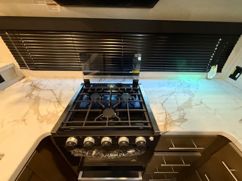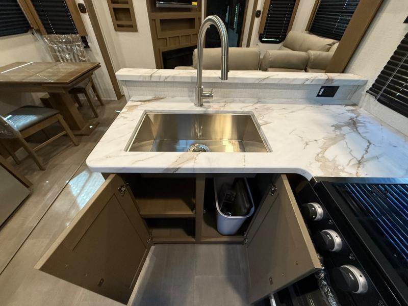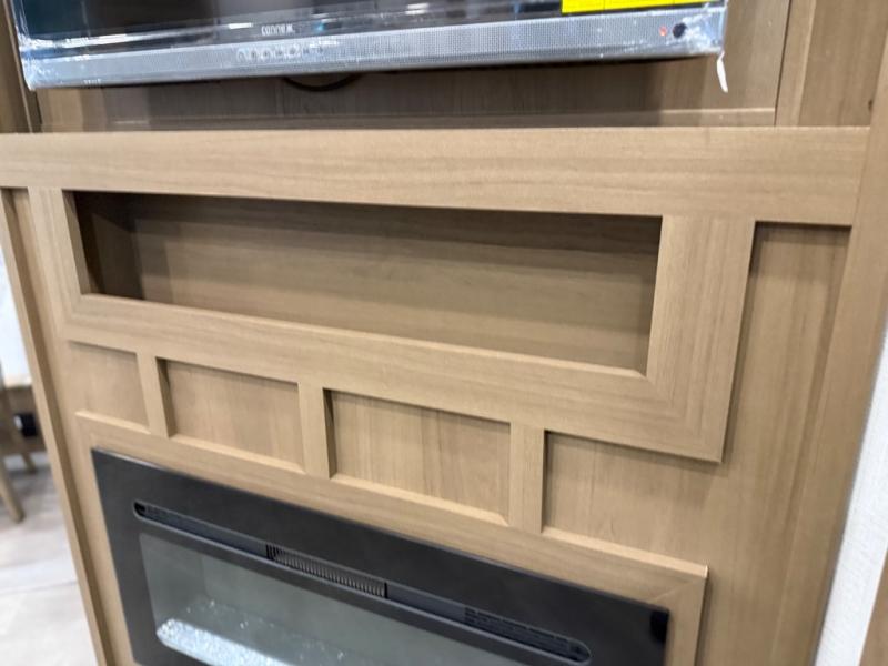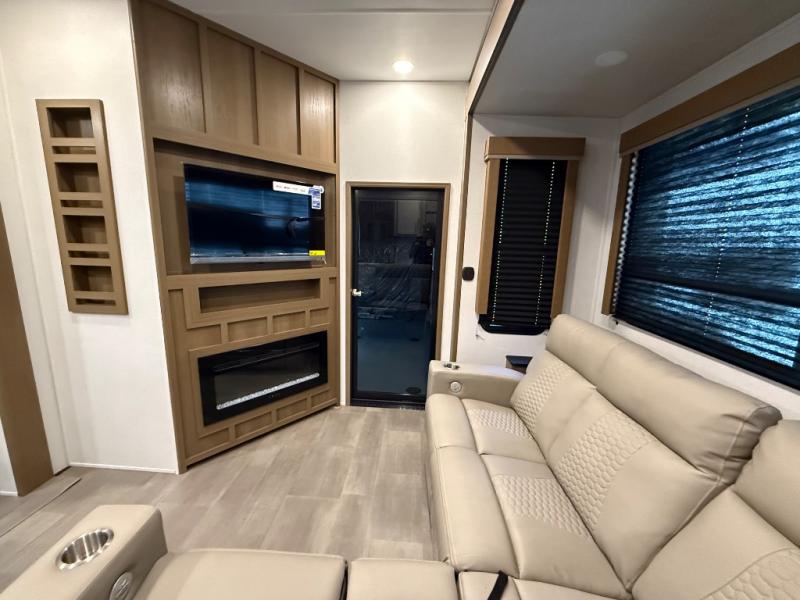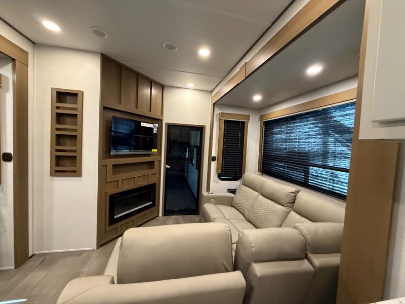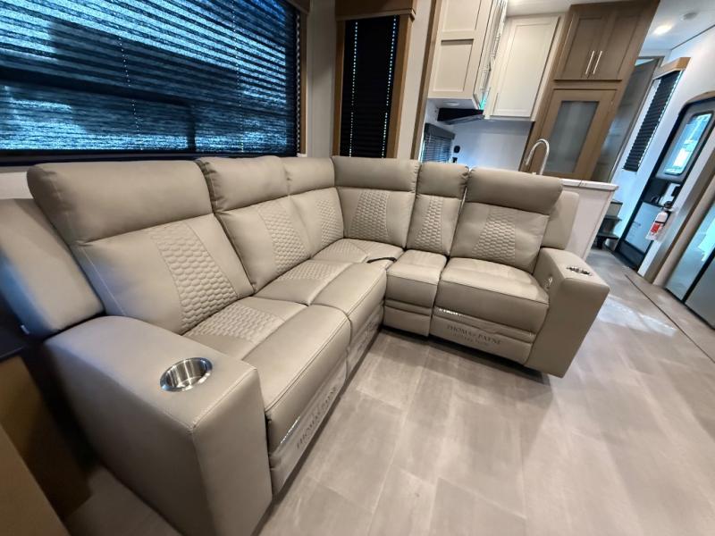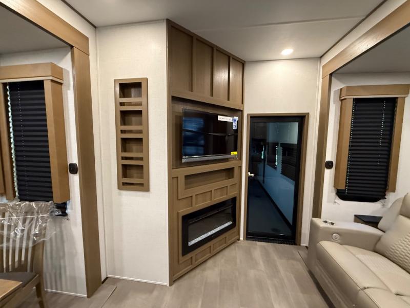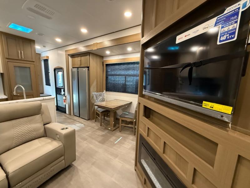 Inside, you’ll find residential-style finishes throughout. The kitchen includes solid-surface countertops, a large 16 cu. ft. refrigerator, deep basin sink, and modern appliances that make meal prep easy. The living area offers a reclining sofa, entertainment center with a large LED TV, and an electric fireplace that creates a warm, inviting atmosphere.