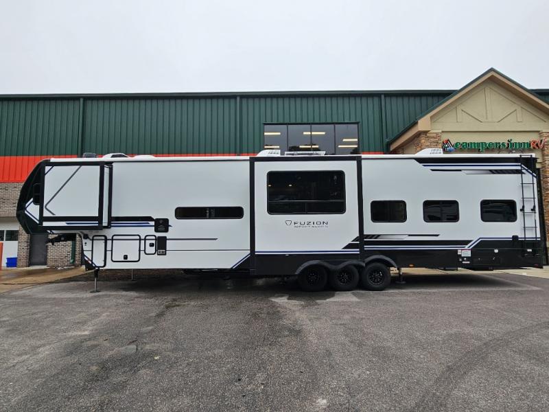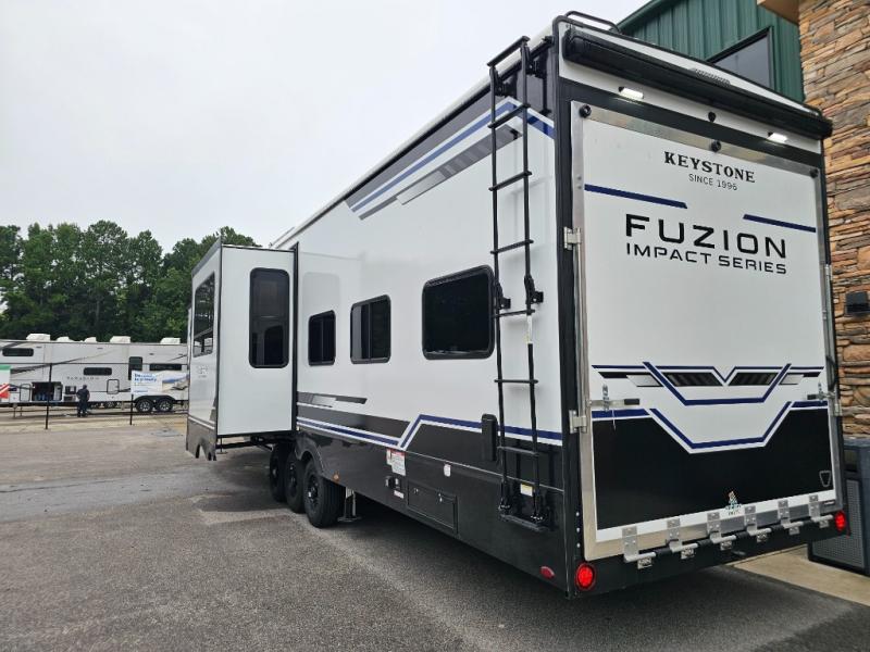 2026 Keystone Fuzion Impact Edition 418 – Triple Slides, Bath and a Half, and a Spacious 15' Garage!