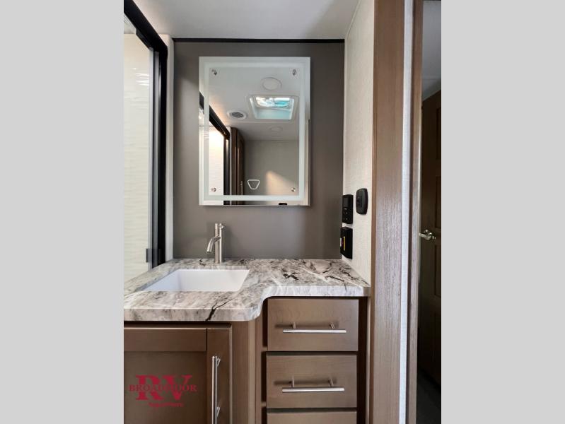 Embrace the great outdoors with a Fuzion Impact Edition toy hauler by Keystone! There are laminated fiberglass sidewalls and a 8' 4" wide-body construction for your toys and gear! The one-piece polypropylene heated underbelly includes enclosed tanks and valves which will help extend your camping season, and the leaf spring suspension system will provide smooth towing. Head inside to enjoy night shades, hardwood cabinetry, and fiberglass backed linoleum floor with no carpet for easy cleaning. Each model also includes a Girard on-demand water heater, two 30 lb. LP tanks, recessed LED puck lighting throughout, and the list of comforts goes on!