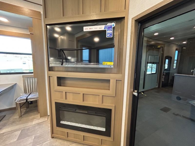 Enjoy time at the campground in this triple slide out toy hauler! The 15' separate garage includes dual opposing sofas with a top queen bed, an 8' garage door, a loft with a bunk mat, plus a half bath! The living area will be a favorite hang-out spot with its L-shaped sofa slide out in great view of the entertainment center with a fireplace. The kitchen features a U-shaped countertop, a spacious pantry and 12V refrigerator, plus a dinette with chairs to dine at. A full bath removes the need to use the camp's facilities, and the front private bedroom will feel just like home with its 60" x 74" queen bed and slide out master closet!