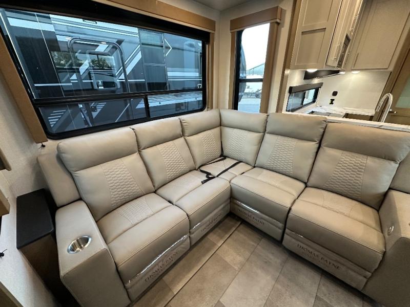 Enjoy time at the campground in this triple slide out toy hauler! The 15' separate garage includes dual opposing sofas with a top queen bed, an 8' garage door, a loft with a bunk mat, plus a half bath! The living area will be a favorite hang-out spot with its L-shaped sofa slide out in great view of the entertainment center with a fireplace. The kitchen features a U-shaped countertop, a spacious pantry and 12V refrigerator, plus a dinette with chairs to dine at. A full bath removes the need to use the camp's facilities, and the front private bedroom will feel just like home with its 60" x 74" queen bed and slide out master closet!
