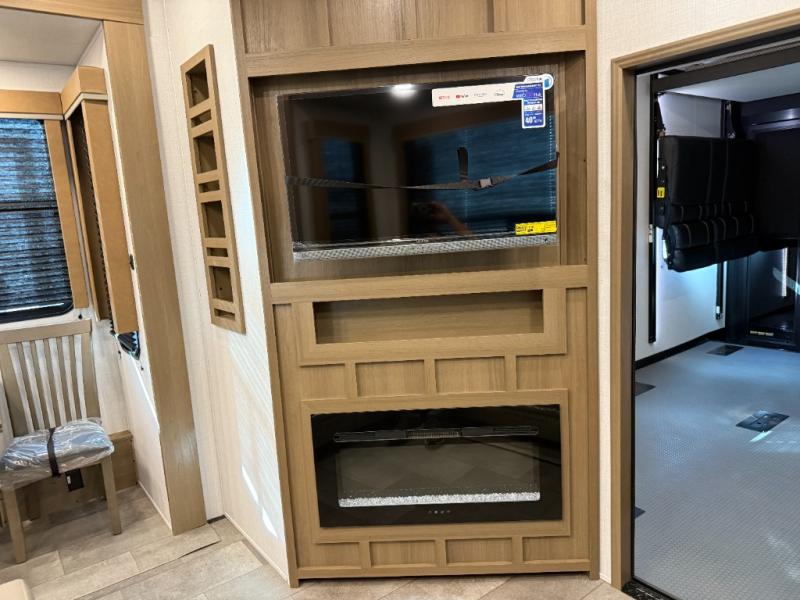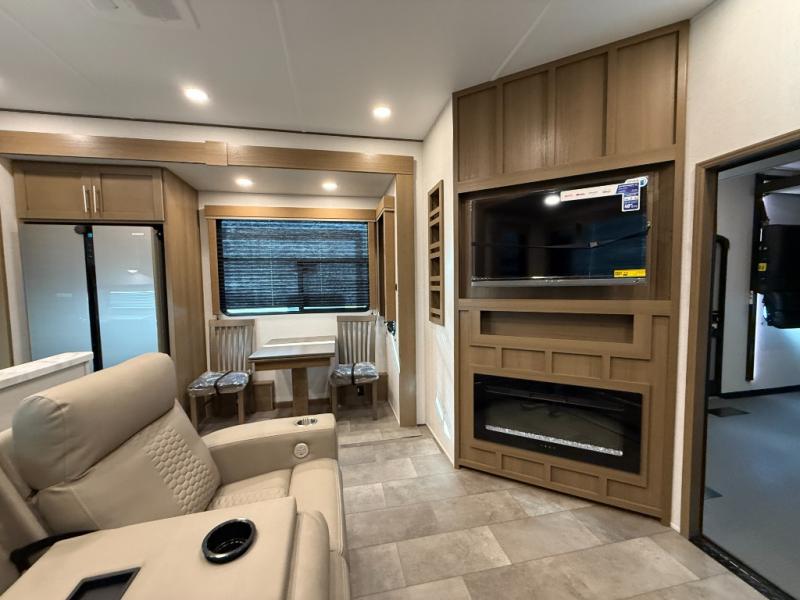Enjoy time at the campground in this triple slide out toy hauler! The 15' separate garage includes dual opposing sofas with a top queen bed, an 8' garage door, a loft with a bunk mat, plus a half bath! The living area will be a favorite hang-out spot with its L-shaped sofa slide out in great view of the entertainment center with a fireplace. The kitchen features a U-shaped countertop, a spacious pantry and 12V refrigerator, plus a dinette with chairs to dine at. A full bath removes the need to use the camp's facilities, and the front private bedroom will feel just like home with its 60" x 74" queen bed and slide out master closet!