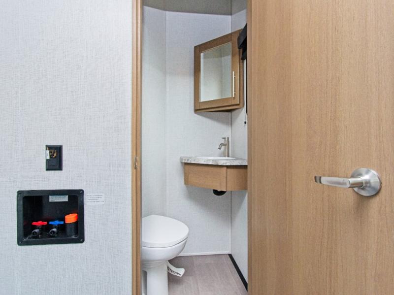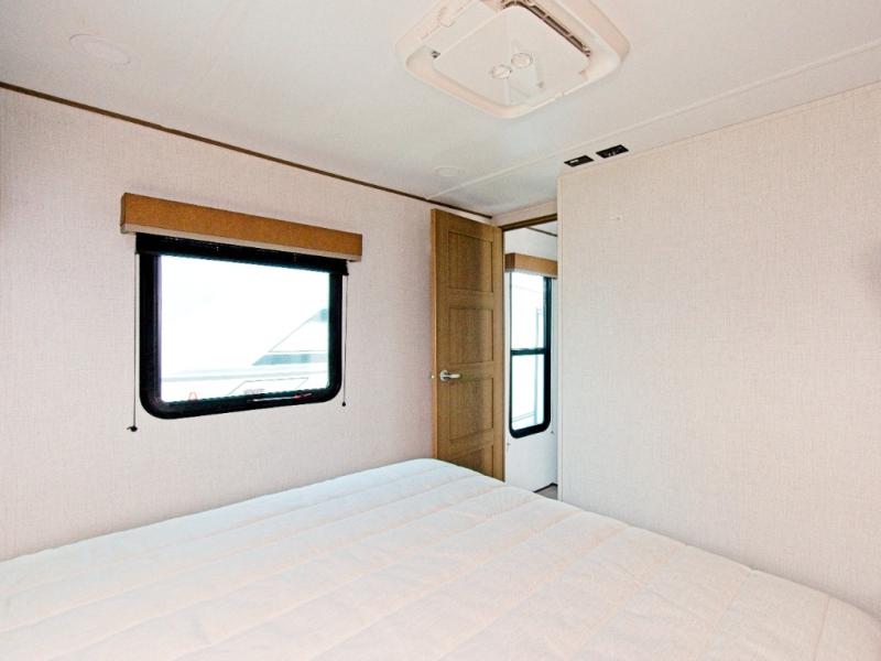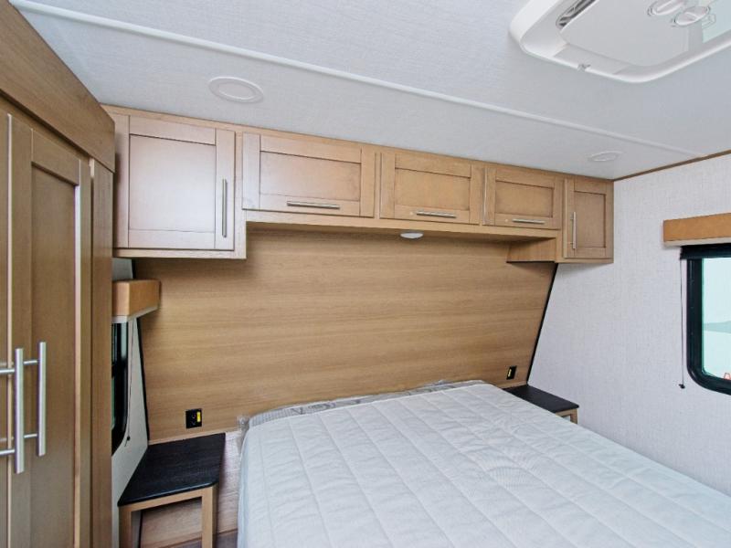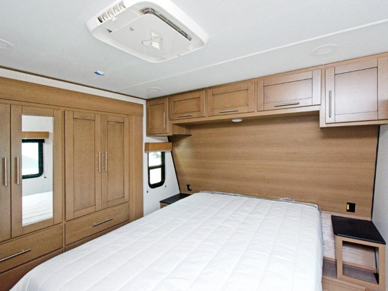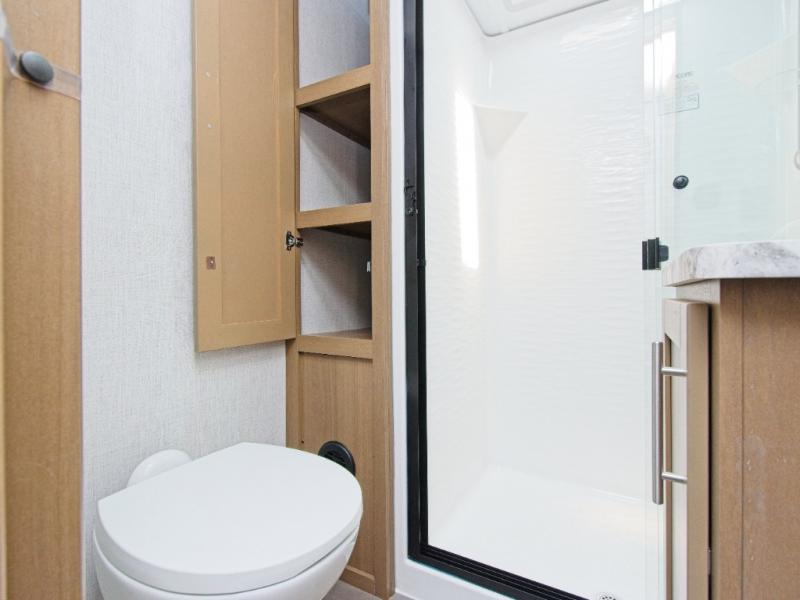 Enjoy the convenience of a full bathroom and retreat to the private front bedroom featuring a 60" x 74" queen bed and a slide-out master closet for all your gear.