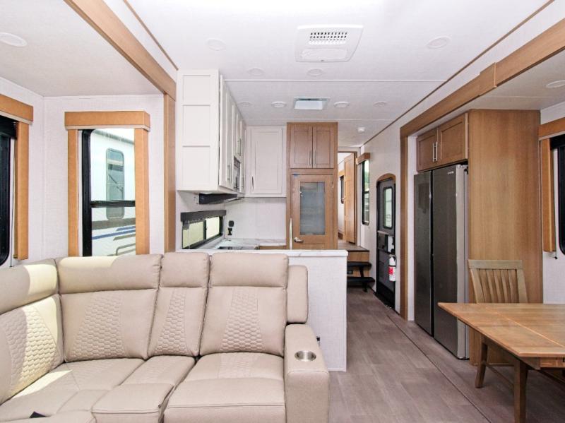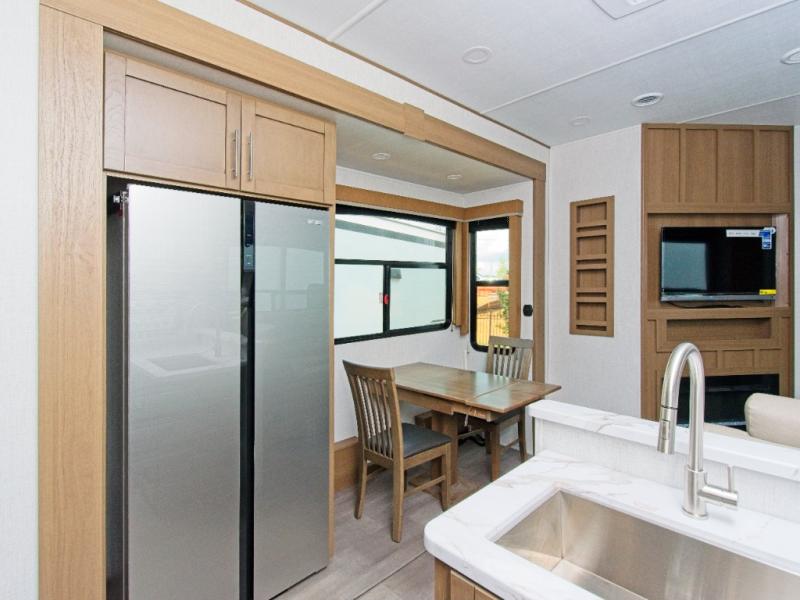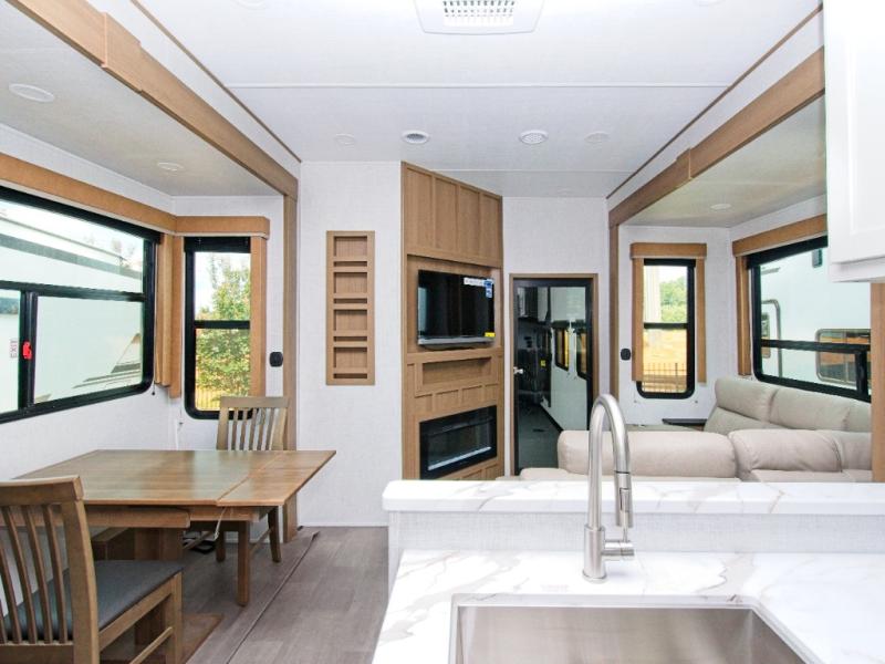 Relax in the inviting living area with an L-shaped sofa slide-out, perfectly positioned for viewing the entertainment center and fireplace. The kitchen boasts a U-shaped countertop, large pantry, and 12V refrigerator, plus a dinette with free-standing chairs for family meals.