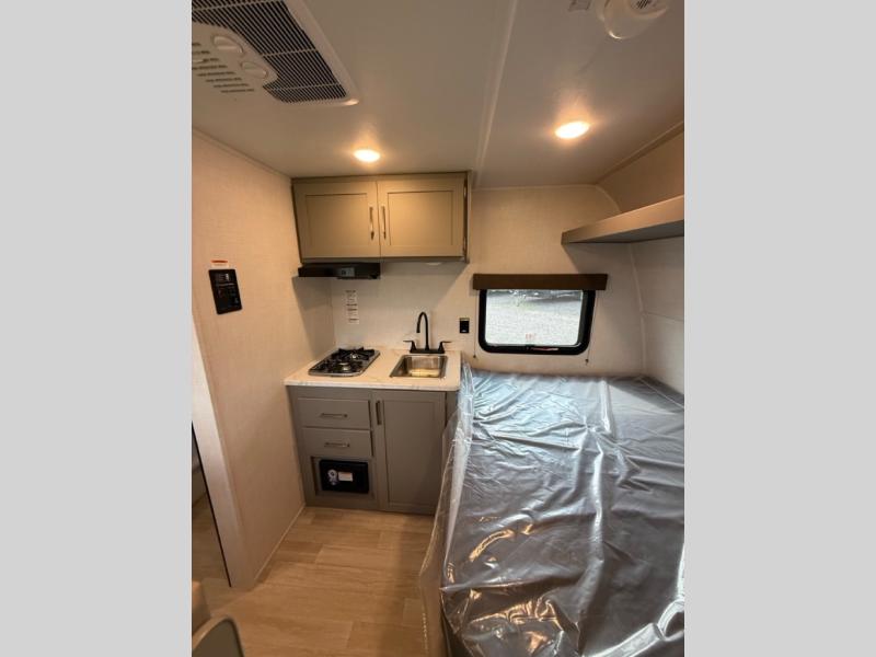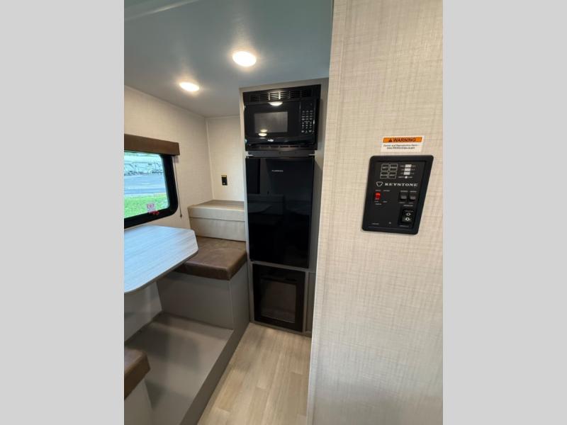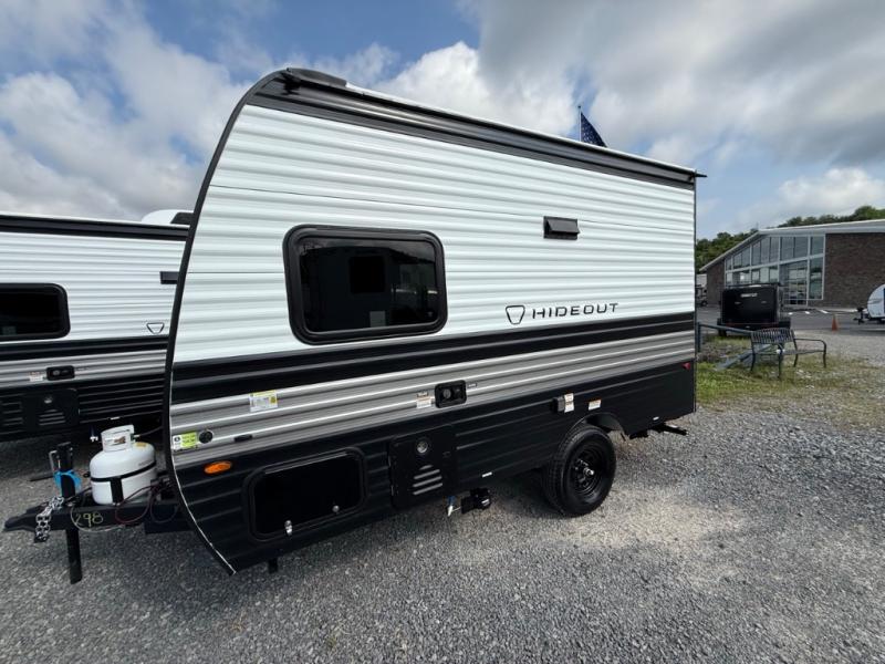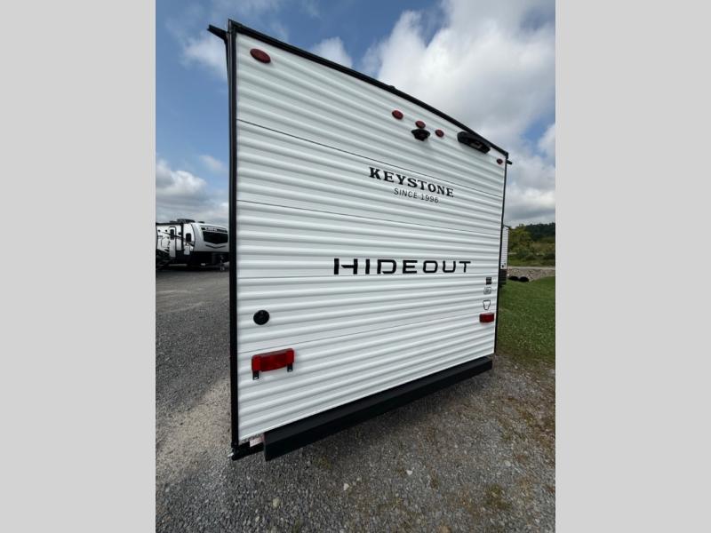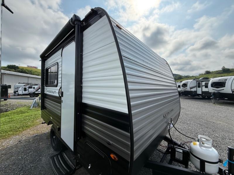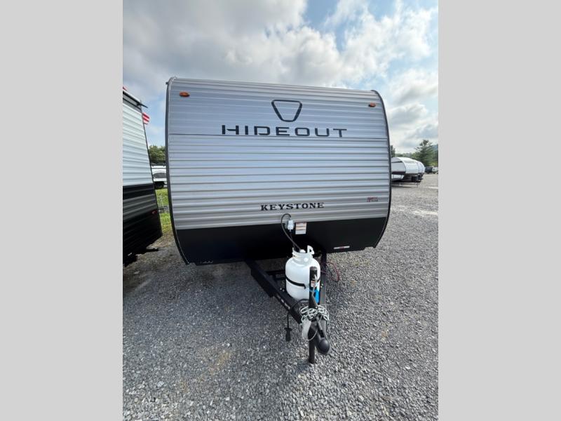 With any Hideout Mini travel trailer by Keystone, you will enjoy lightweight towing thanks to their single-axle! The AlphaPly TPO roof membrane is ultra durable, and the power awning will provide protection from the sun as you relax in your camp chairs outside. Each model includes blackout night shades, LED lighting, plus many more interior comforts. There is also a roof A/C and 20K BTU furnace to keep you comfortable, plus a tankless water heater for endless hot showers!