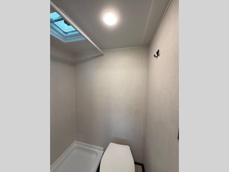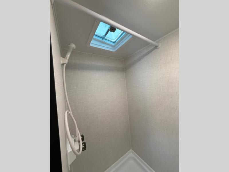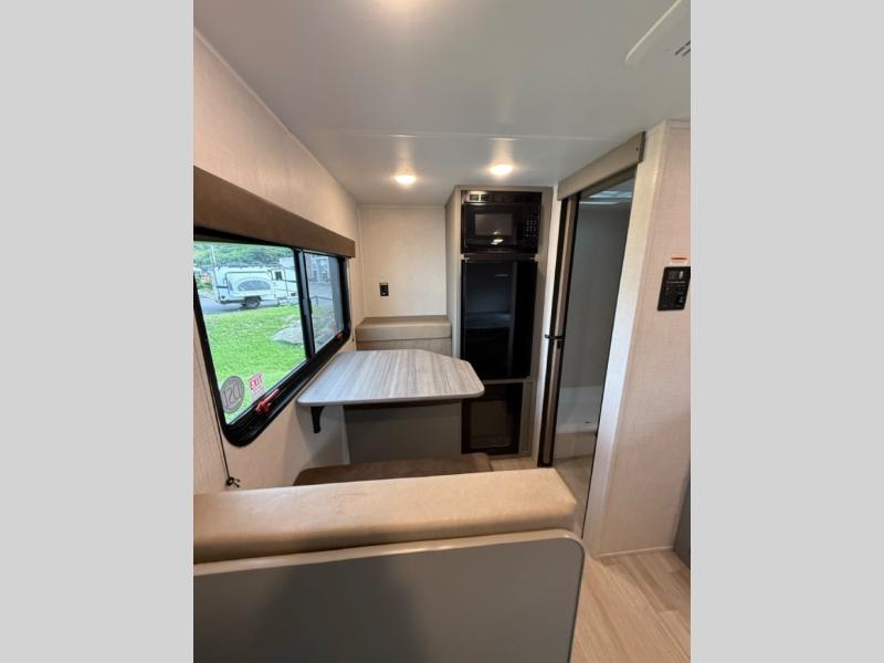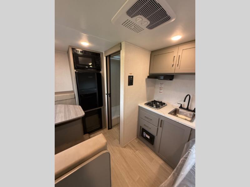 This lightweight travel trailer is perfect for three happy campers. You'll enjoy the front full-size bed, while your guest or little ones take the booth dinette when it's not being used to dine at. There is also a shelf above the bed to keep your things organized. A private bath includes a shower with a toilet so you can freshen up each day without having to leave your camper. You can make your meals on the two burner gas cooktop or in the microwave oven, then take your plate outdoors to eat under the 8' power awning!