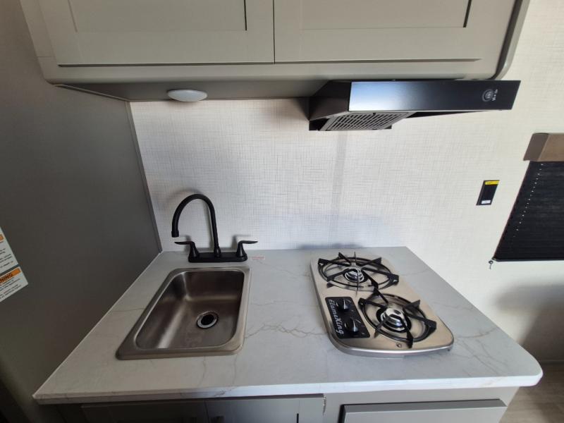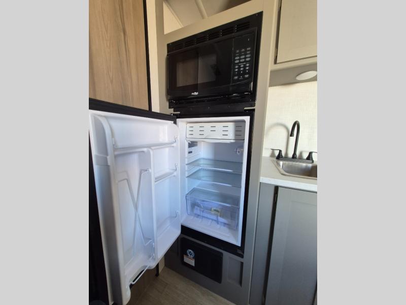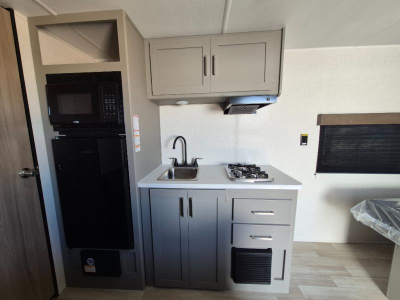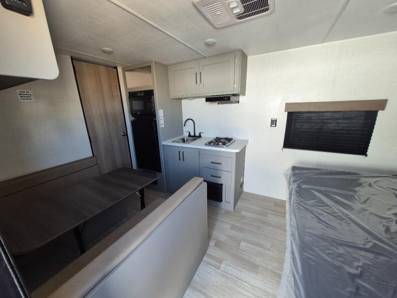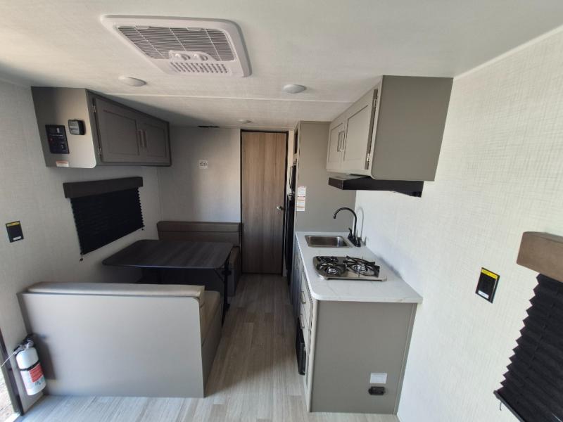 With any Hideout Mini travel trailer by Keystone, you will enjoy lightweight towing thanks to their single-axle! The AlphaPly TPO roof membrane is ultra durable, and the power awning will provide protection from the sun as you relax in your camp chairs outside. Each model includes blackout night shades, LED lighting, plus many more interior comforts. There is also a roof A/C and 20K BTU furnace to keep you comfortable, plus a tankless water heater for endless hot showers!