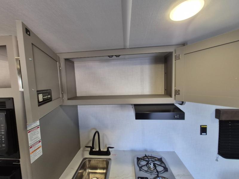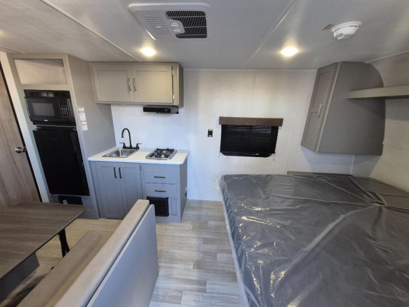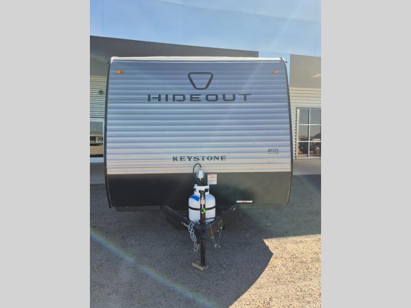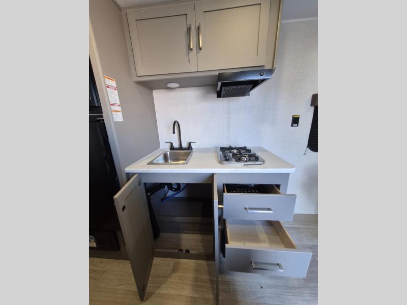 With any Hideout Mini travel trailer by Keystone, you will enjoy lightweight towing thanks to their single-axle! The AlphaPly TPO roof membrane is ultra durable, and the power awning will provide protection from the sun as you relax in your camp chairs outside. Each model includes blackout night shades, LED lighting, plus many more interior comforts. There is also a roof A/C and 20K BTU furnace to keep you comfortable, plus a tankless water heater for endless hot showers!