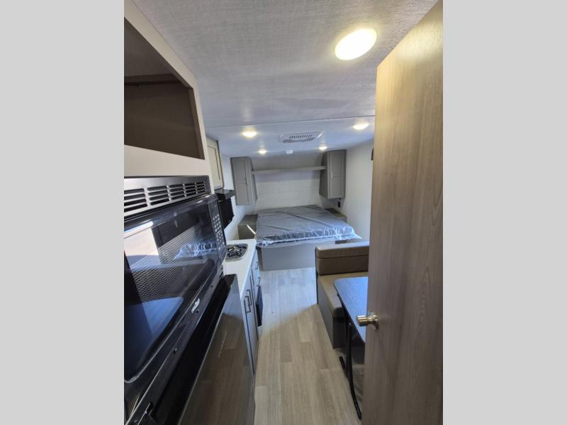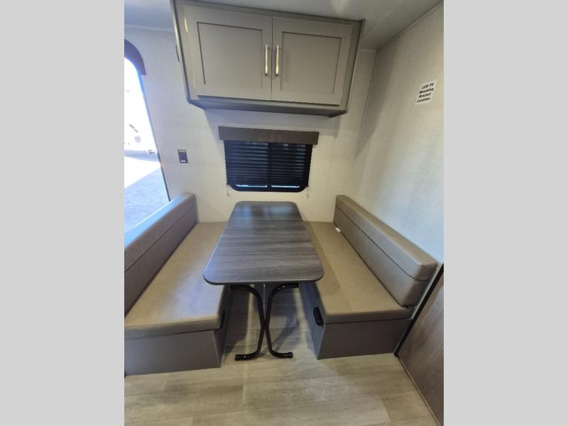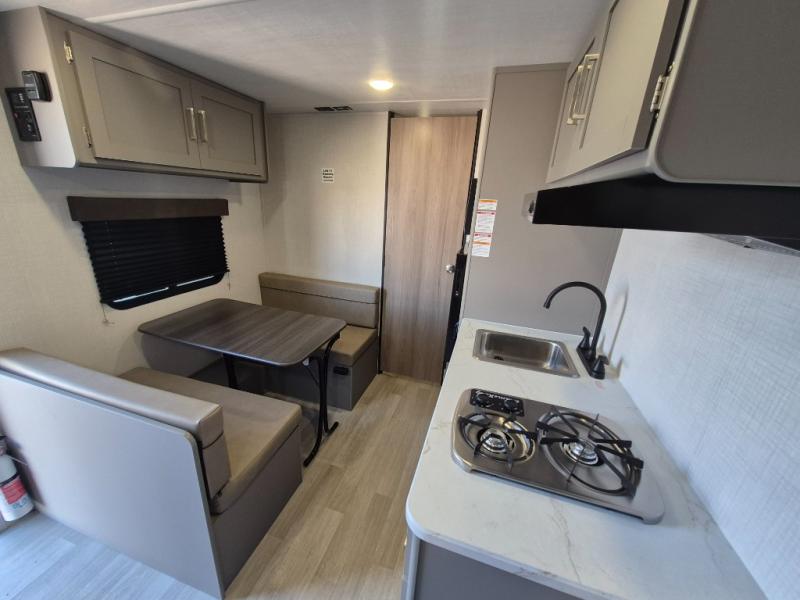 It's time to enjoy the great outdoors with family and friends at the campgrounds you like to meet everyone at! This trailer will allow three to four to camp comfortability with amenities such as a two burner cooktop, a 3.3 cu. ft. refrigerator, and a spacious rear full bathroom. The booth dinette offers a place to dine, read a book and even house an overnight guest. This model also includes a walk-around queen bed that will make your space feel a little more like home!