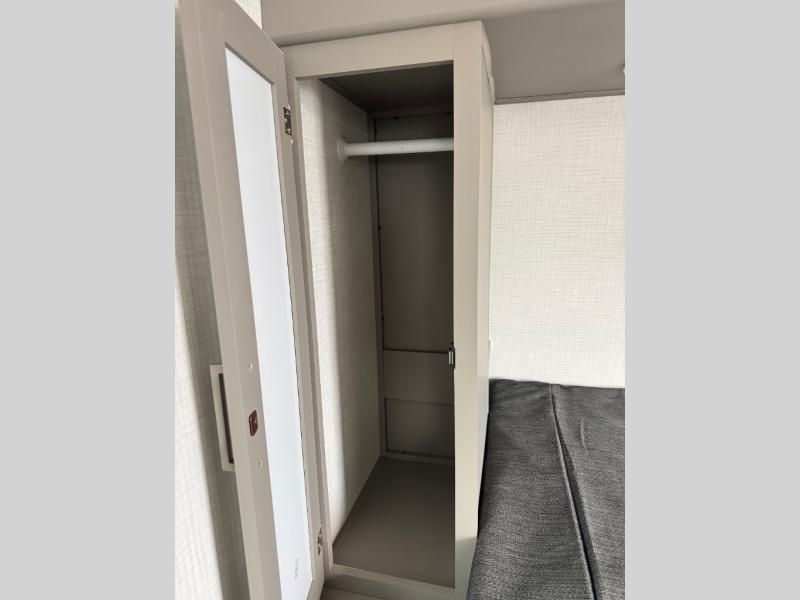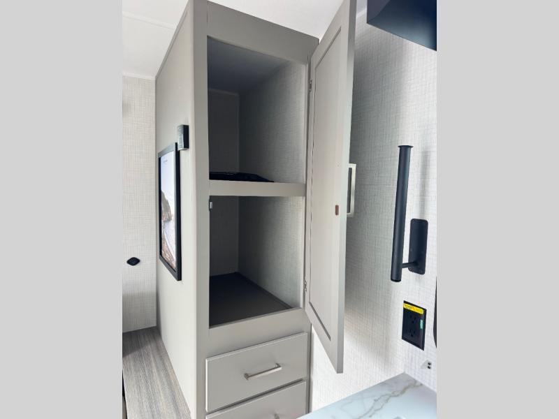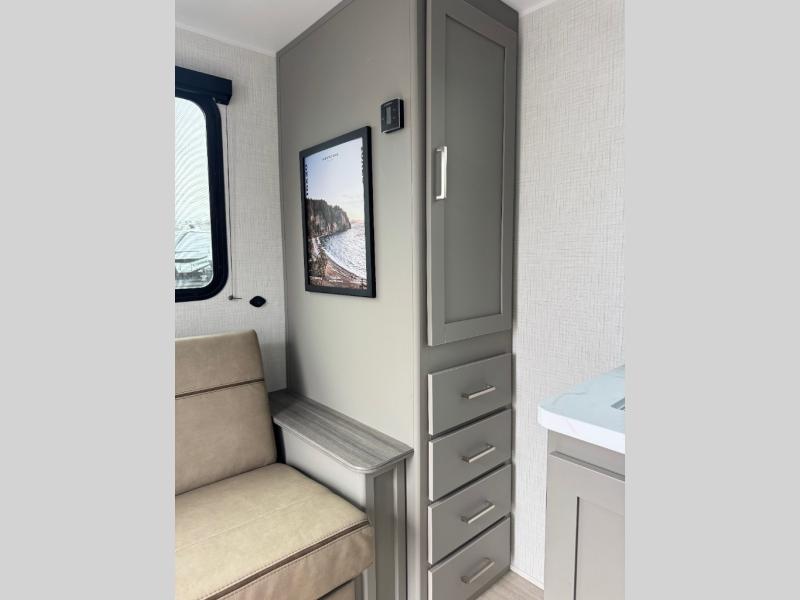 This travel trailer features dual entry doors, allowing you to enter in through the front master bedroom or the rear living room! The rear sofa with end tables provides a place to relax each day, and the booth dinette gives you a place to dine together. And both of these pieces of furniture can double as sleeping space for guests! A three-burner cooktop and air fryer microwave will let you make meals each day, and a 12V refrigerator and pantry will keep food stored away. The walk-thru bath leads to the front master bedroom where you'll find a walk-around RV Olympic RV queen bed, dual wardrobes and an overhead shelf for tons of storage!