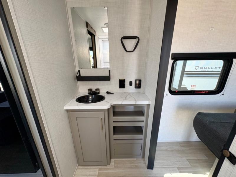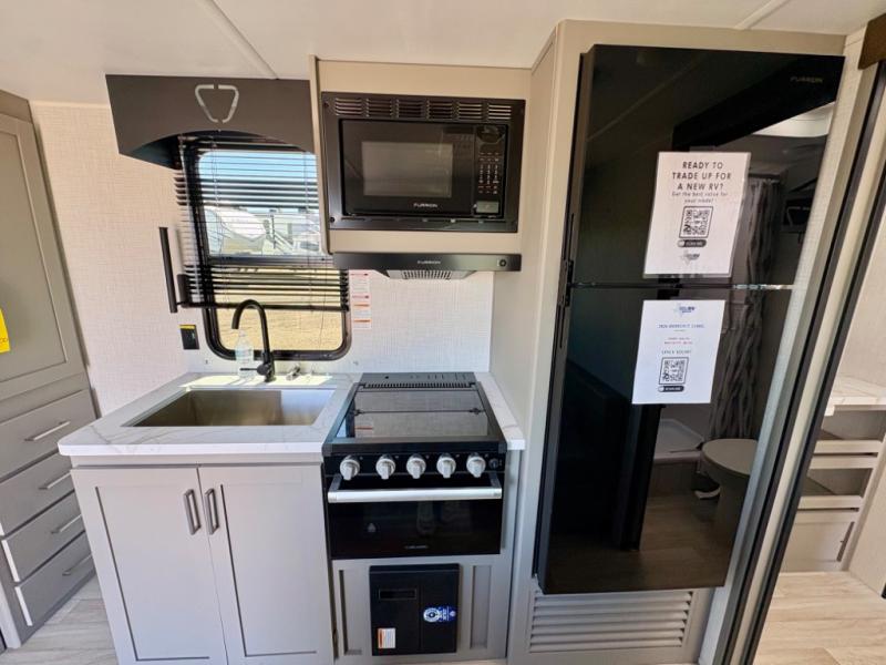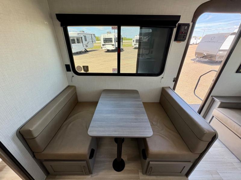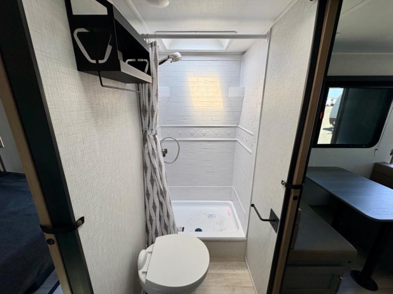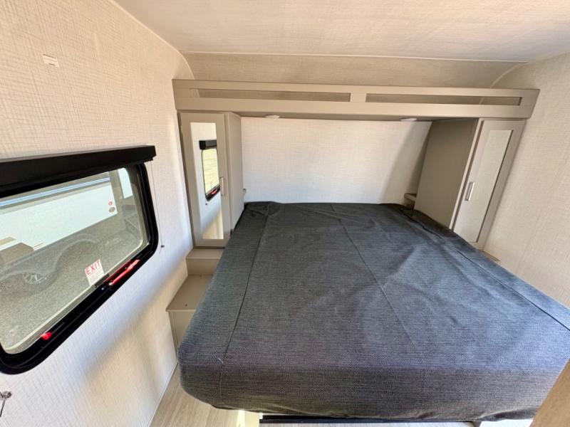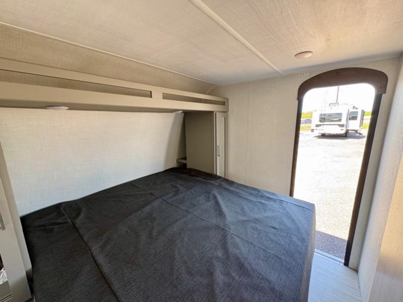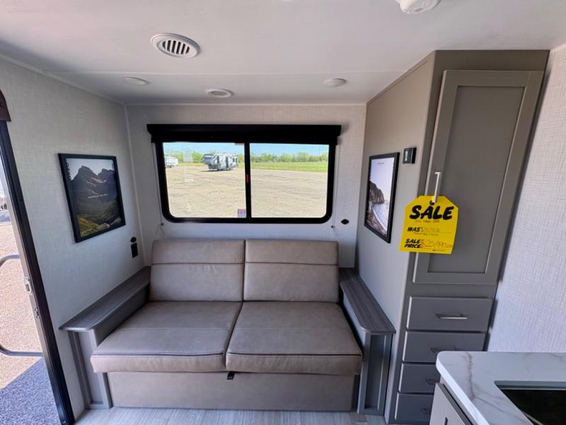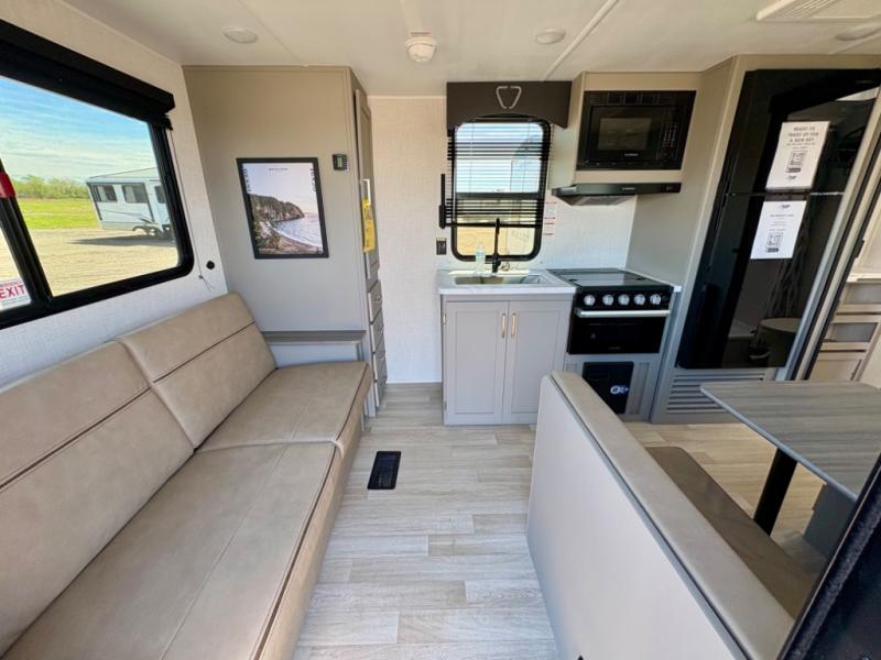 This travel trailer features dual entry doors, allowing you to enter in through the front master bedroom or the rear living room! The rear sofa with end tables provides a place to relax each day, and the booth dinette gives you a place to dine together. And both of these pieces of furniture can double as sleeping space for guests! A three-burner cooktop and air fryer microwave will let you make meals each day, and a 12V refrigerator and pantry will keep food stored away. The walk-thru bath leads to the front master bedroom where you'll find a walk-around RV Olympic RV queen bed, dual wardrobes and an overhead shelf for tons of storage!