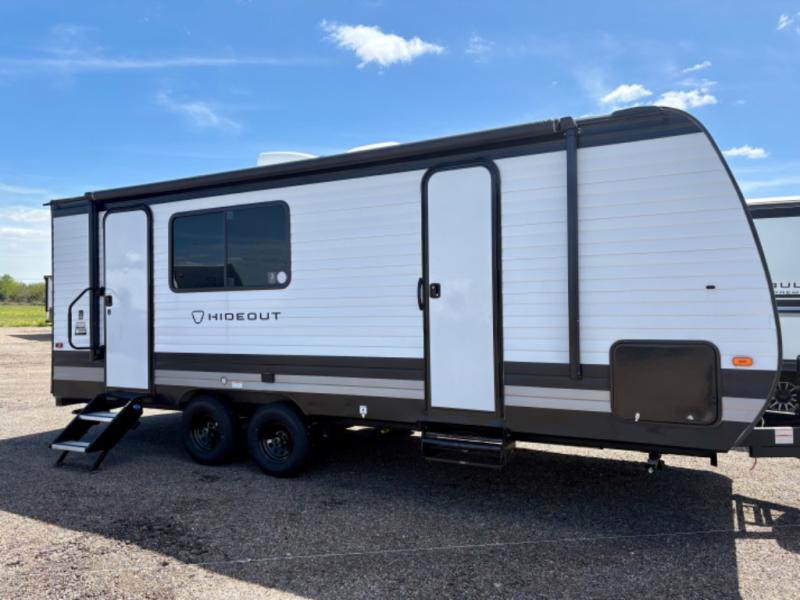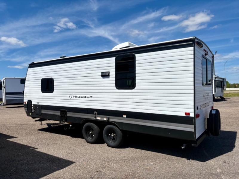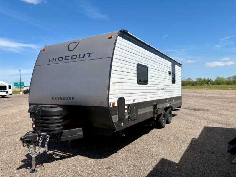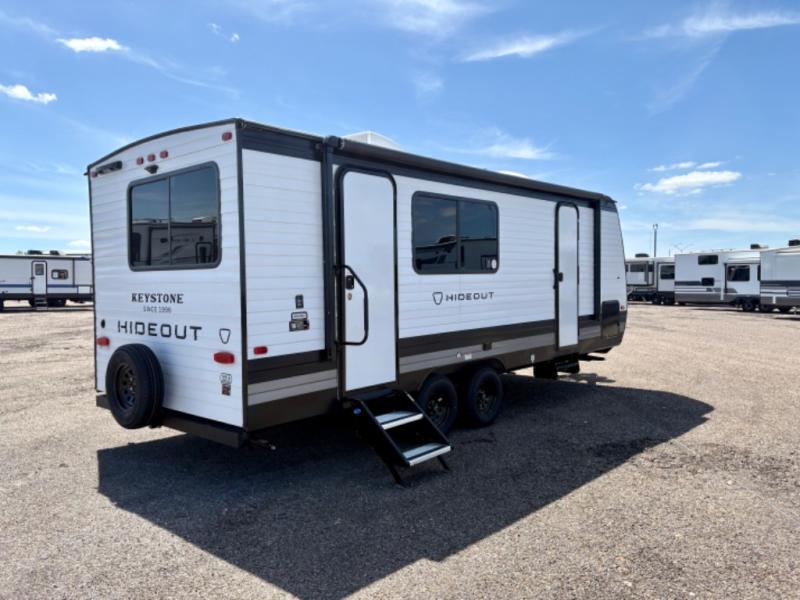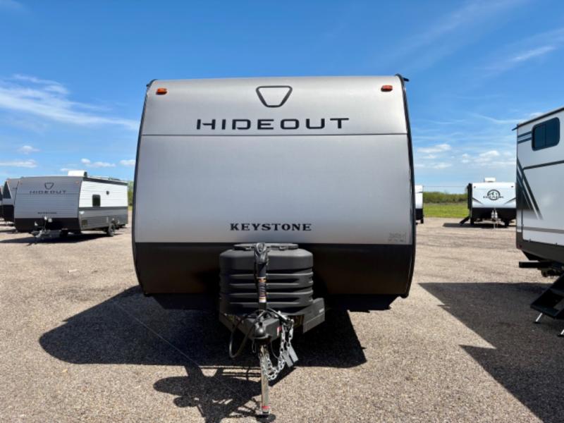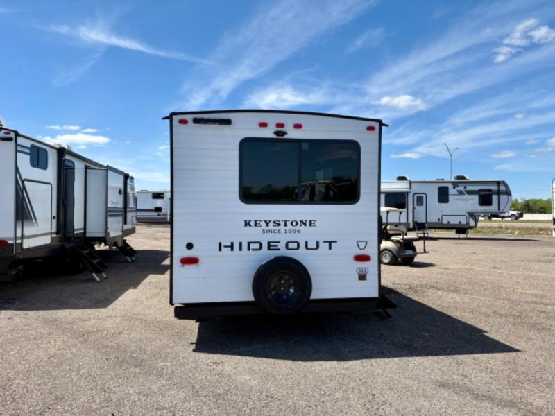 With any Hideout travel trailer by Keystone, you will find functional features and comfort at every turn! Each one is built with tinted safety glass windows and a walkable roof for added durability. There are also Solid Step entry steps outside, along with an outside shower, heavy-duty stabilizer jacks, a spare tire kit and Tire Linc TPMS prep. You'll love the pressed membrane premium countertops inside, plus a decorative tub surround, LED lighting, blackout night shades, and many more comforts. Additional features include a tankless water heater, a porcelain foot flush toilet, a power tongue jack, and an XL entry assist handle to name just a few!