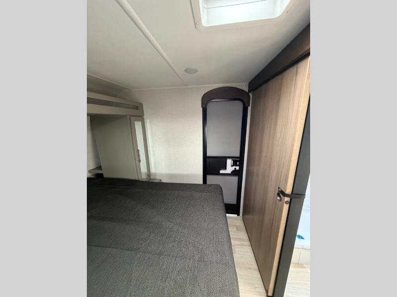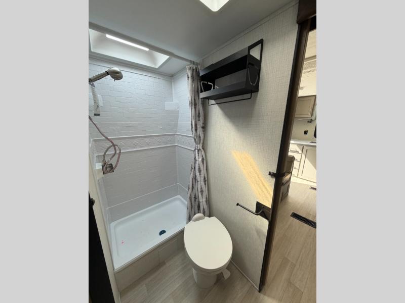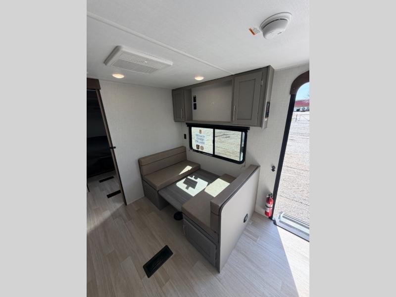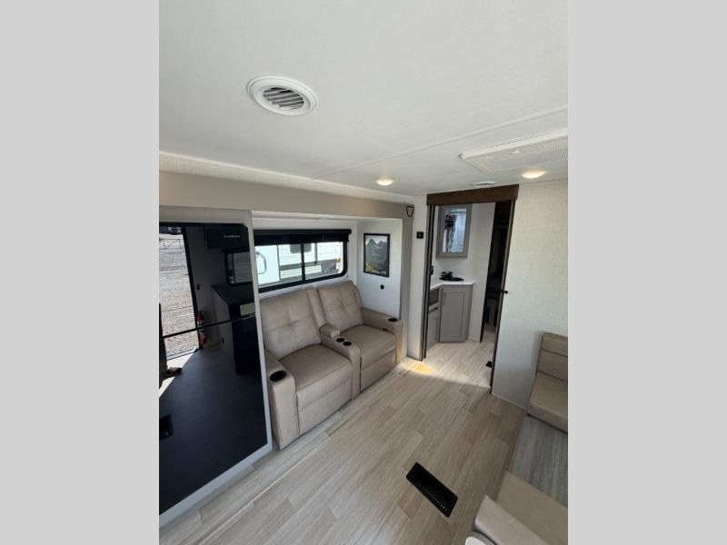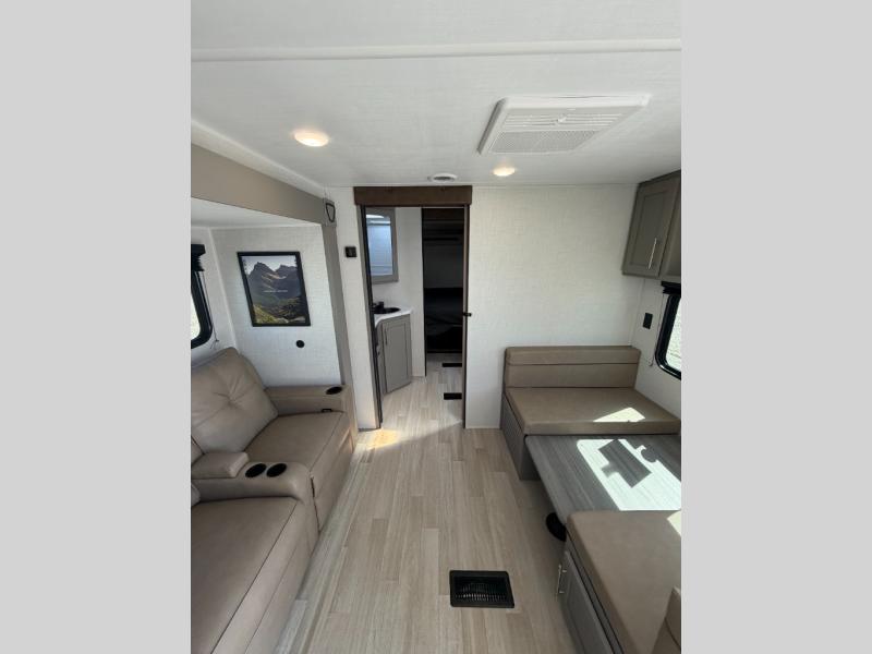 This travel trailer offers a comfortable layout! The rear kitchen is a chef's dream, featuring a three-burner stove, pantry, sink, and fridge - prep meals with ease. The booth dinette is perfect for dining, and the theater seating is ideal for relaxing. The walk-through bathroom is a plus, leading to the front bedroom with an Olympic RV queen bed and plenty of wardrobe space. And with double entry doors, getting in and out is a breeze. Perfect for couples or small families looking for a cozy getaway!