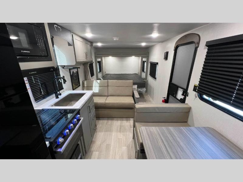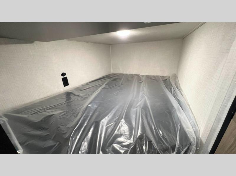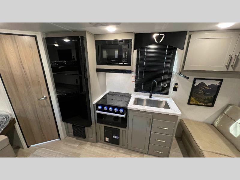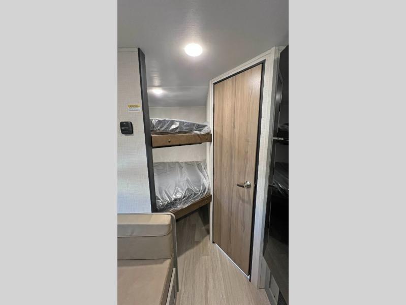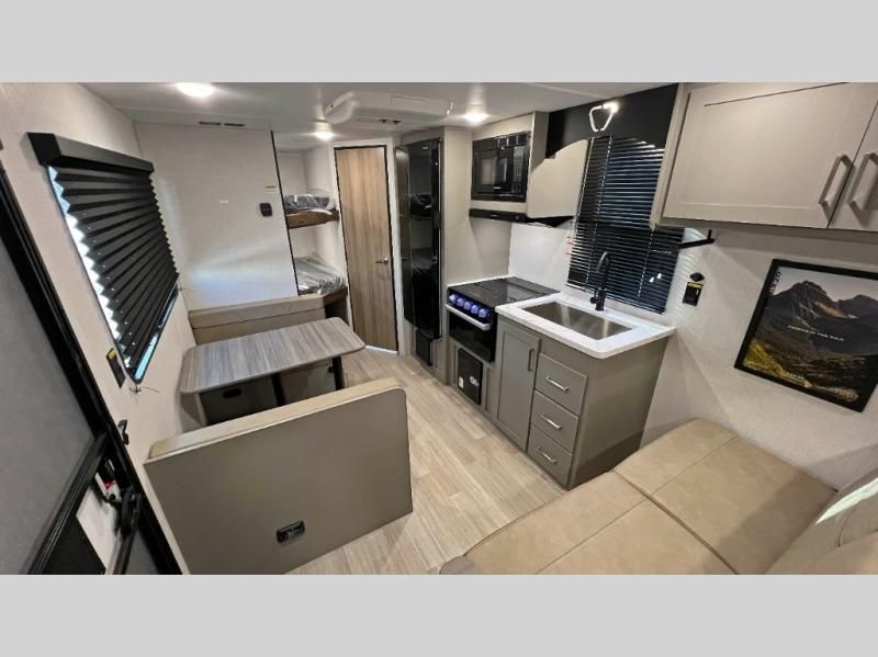 The whole gang will love camping in this travel trailer with double-size bunks! You'll enjoy your own Olympic RV queen bed up front in the semi-private bedroom, along with dual wardrobes to keep your things tidy. Once the chef of your group has made dinner on the three-burner cooktop, you can dine at the booth dinette or take your plate outdoors to sit under the 16' power awning with LED lights. There is also a sofa with an end table inside that will provide additional seating and sleeping space. And don't overlook the rear corner full bath adjacent to the bunks for easy nighttime use!
