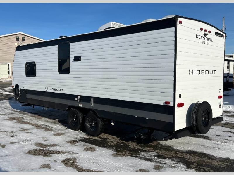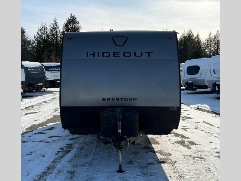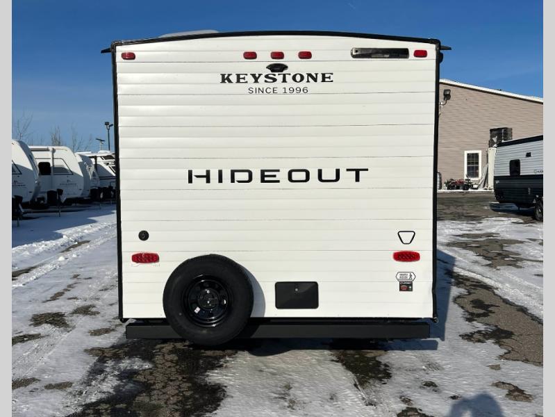 With any Hideout travel trailer by Keystone, you will find functional features and comfort at every turn! Each one is built with tinted safety glass windows and a walkable roof for added durability. There are also Solid Step entry steps outside, along with an outside shower, heavy-duty stabilizer jacks, a spare tire kit and Tire Linc TPMS prep. You'll love the pressed membrane premium countertops inside, plus a decorative tub surround, LED lighting, blackout night shades, and many more comforts. Additional features include a tankless water heater, a porcelain foot flush toilet, a power tongue jack, and an XL entry assist handle to name just a few!