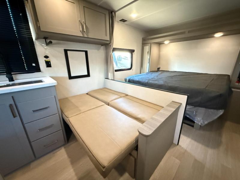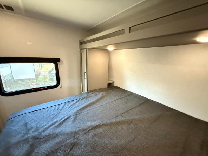 The whole gang will love camping in this travel trailer with double-size bunks! You'll enjoy your own Olympic RV queen bed up front in the semi-private bedroom, along with dual wardrobes to keep your things tidy. Once the chef of your group has made dinner on the three-burner cooktop, you can dine at the booth dinette or take your plate outdoors to sit under the 16' power awning with LED lights. There is also a sofa with an end table inside that will provide additional seating and sleeping space. And don't overlook the rear corner full bath adjacent to the bunks for easy nighttime use!