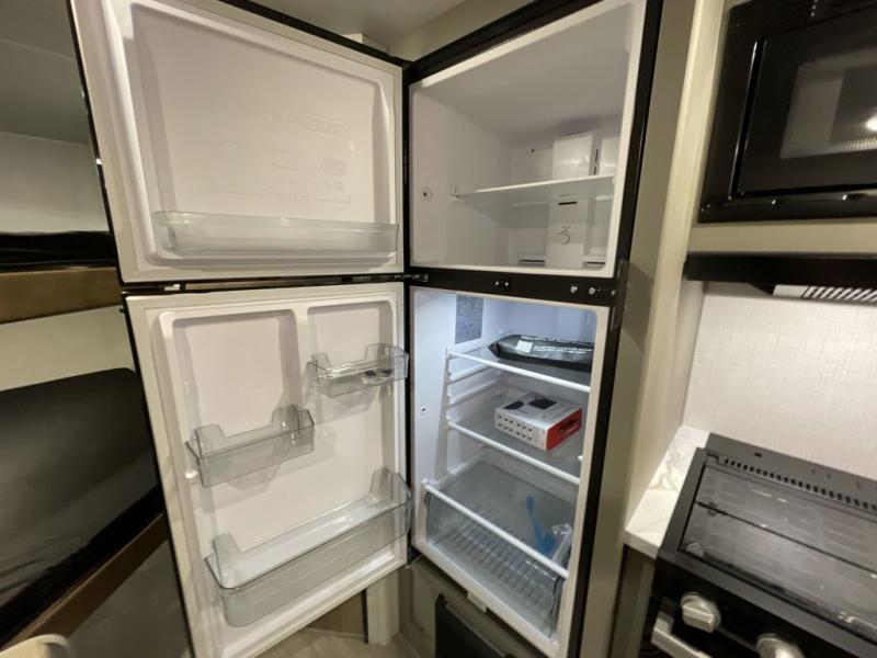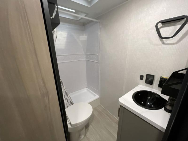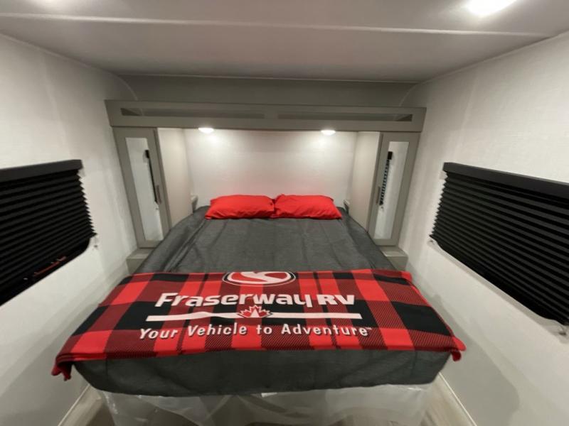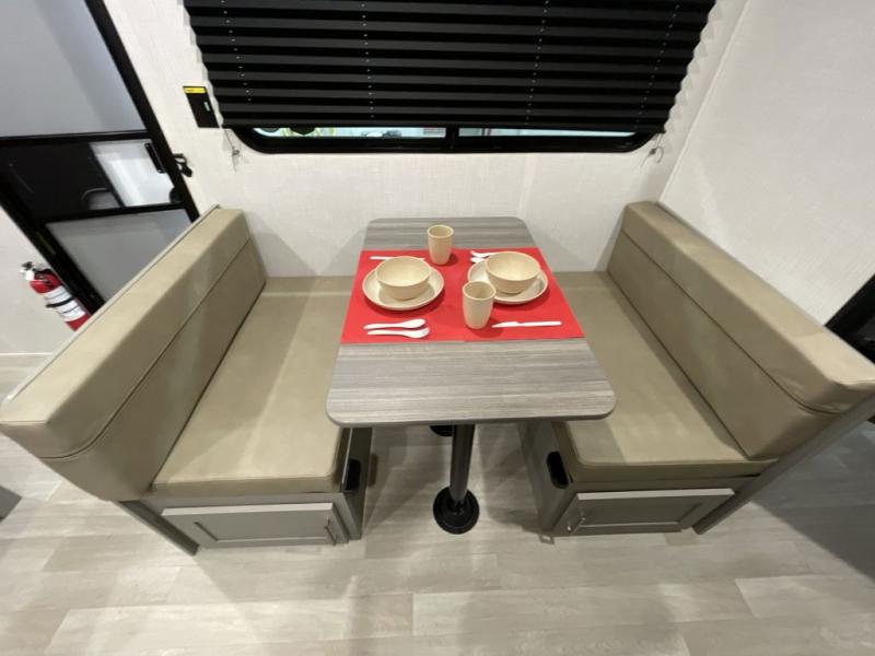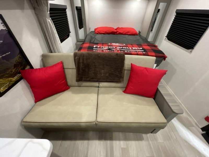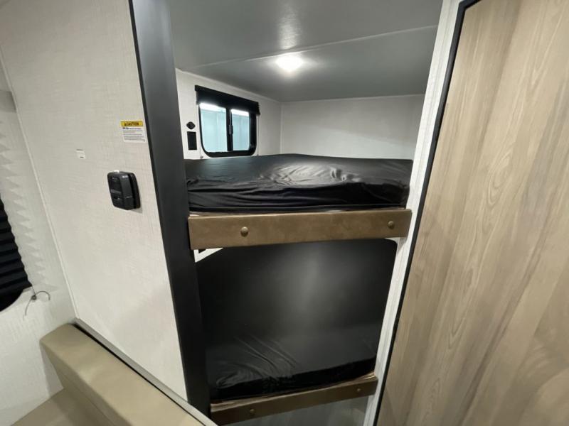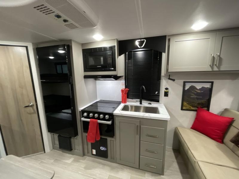 The whole gang will love camping in this travel trailer with double-size bunks! You'll enjoy your own Olympic RV queen bed up front in the semi-private bedroom, along with dual wardrobes to keep your things tidy. Once the chef of your group has made dinner on the three-burner cooktop, you can dine at the booth dinette or take your plate outdoors to sit under the 16' power awning with LED lights. There is also a sofa with an end table inside that will provide additional seating and sleeping space. And don't overlook the rear corner full bath adjacent to the bunks for easy nighttime use!