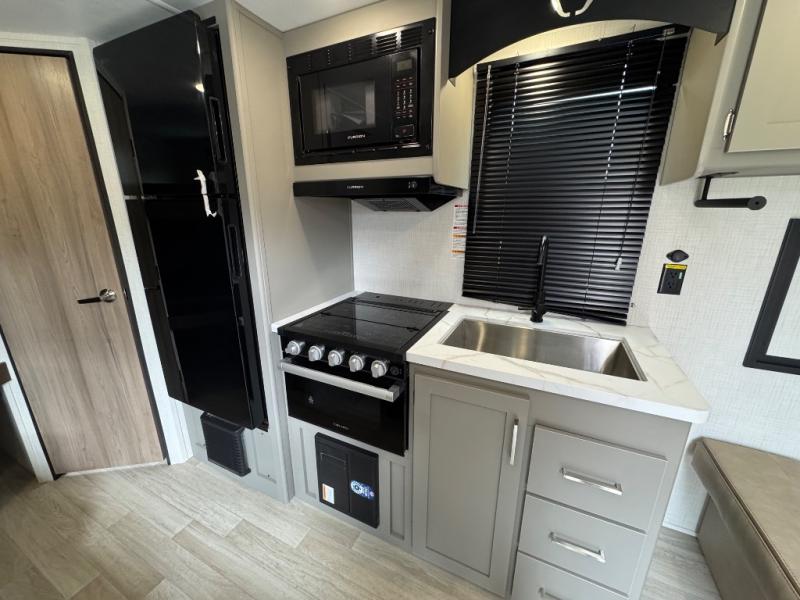 With any Hideout travel trailer by Keystone, you will find functional features and comfort at every turn! Each one is built with tinted safety glass windows and a walkable roof for added durability. There are also Solid Step entry steps outside, along with an outside shower, heavy-duty stabilizer jacks, a spare tire kit and Tire Linc TPMS prep. You'll love the pressed membrane premium countertops inside, plus a decorative tub surround, LED lighting, blackout night shades, and many more comforts. Additional features include a tankless water heater, a porcelain foot flush toilet, a power tongue jack, and an XL entry assist handle to name just a few!