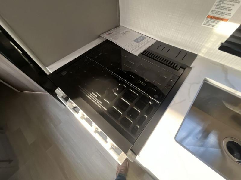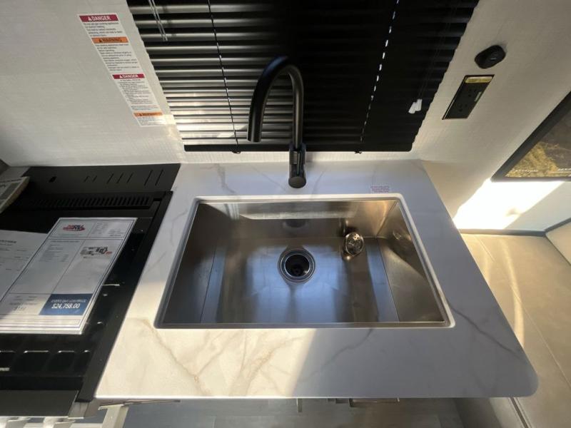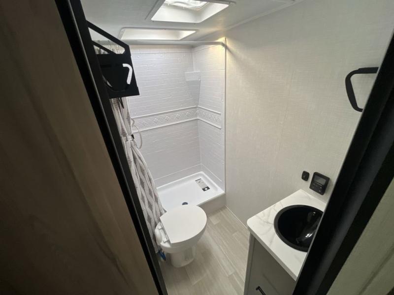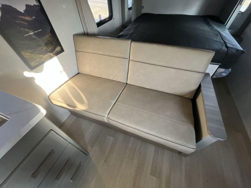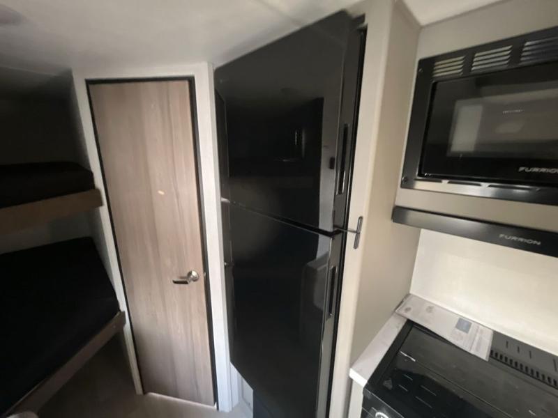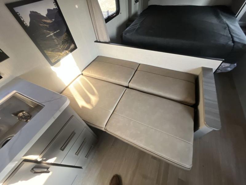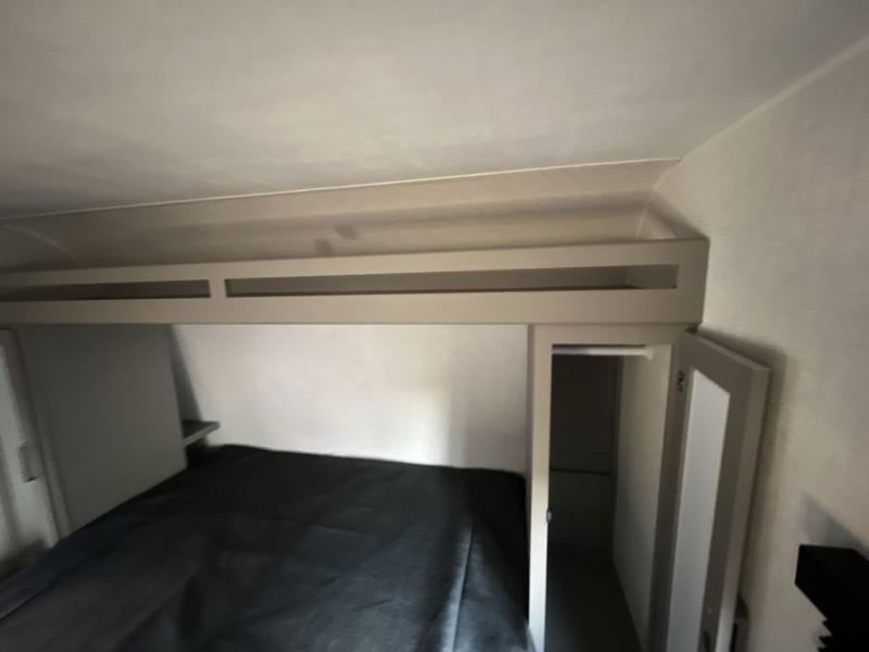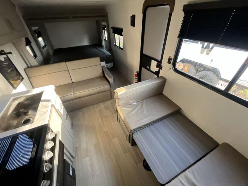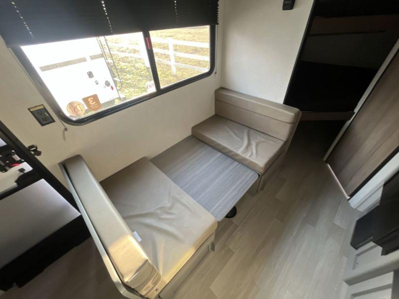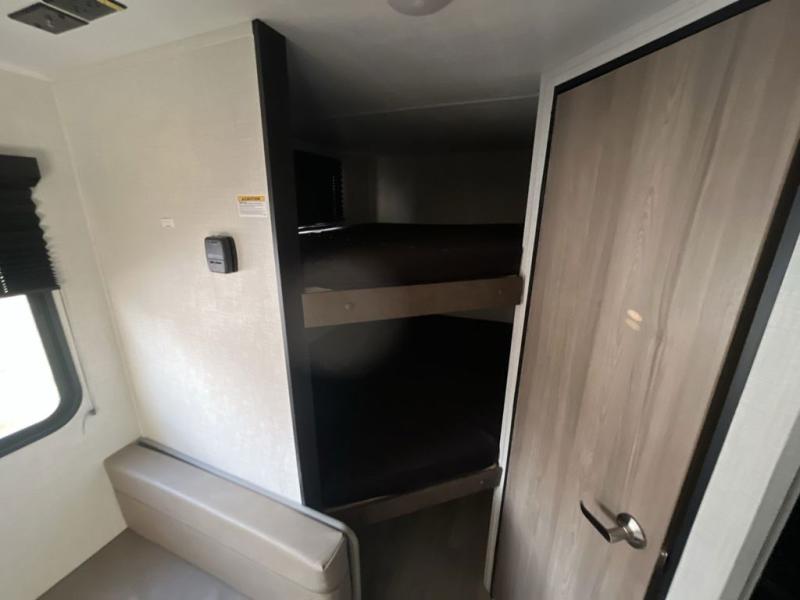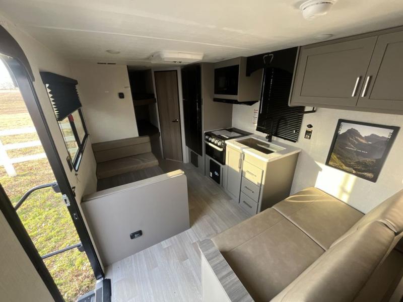 The whole gang will love camping in this travel trailer with double-size bunks! You'll enjoy your own Olympic RV queen bed up front in the semi-private bedroom, along with dual wardrobes to keep your things tidy. Once the chef of your group has made dinner on the three-burner cooktop, you can dine at the booth dinette or take your plate outdoors to sit under the 16' power awning with LED lights. There is also a sofa with an end table inside that will provide additional seating and sleeping space. And don't overlook the rear corner full bath adjacent to the bunks for easy nighttime use!