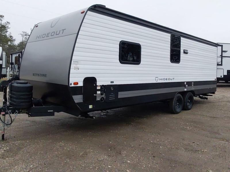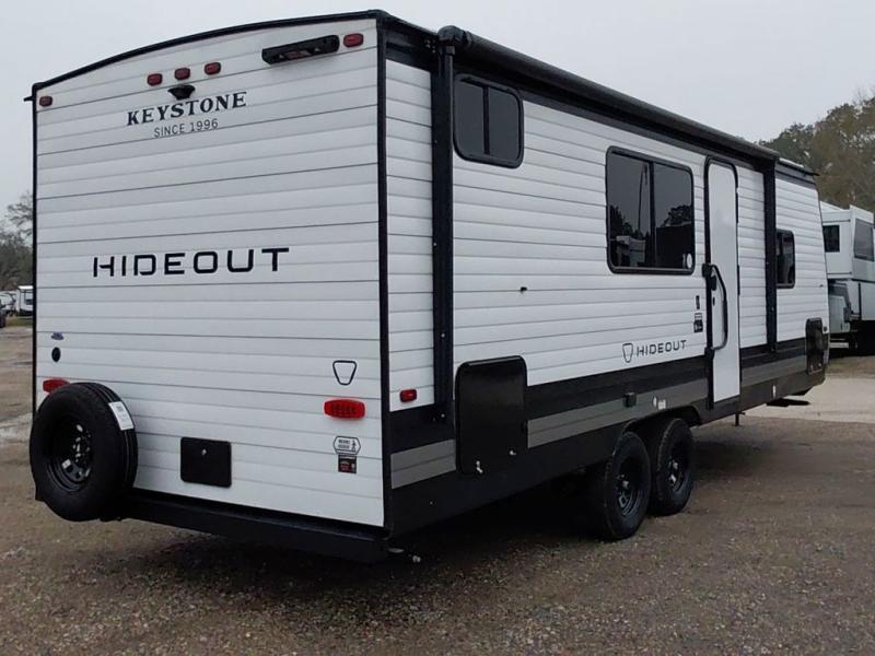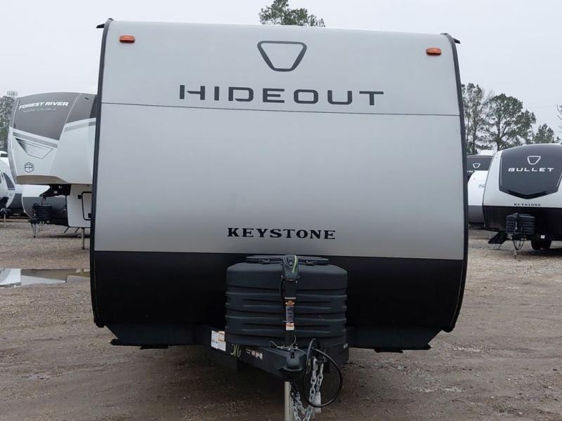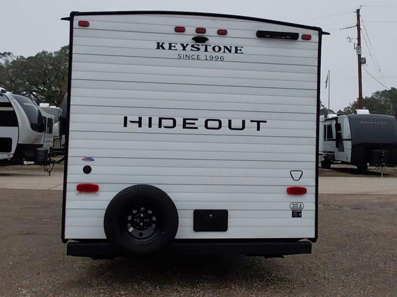With any Hideout travel trailer by Keystone, you will find functional features and comfort at every turn! Each one is built with tinted safety glass windows and a walkable roof for added durability. There are also Solid Step entry steps outside, along with an outside shower, heavy-duty stabilizer jacks, a spare tire kit and Tire Linc TPMS prep. You'll love the pressed membrane premium countertops inside, plus a decorative tub surround, LED lighting, blackout night shades, and many more comforts. Additional features include a tankless water heater, a porcelain foot flush toilet, a power tongue jack, and an XL entry assist handle to name just a few!