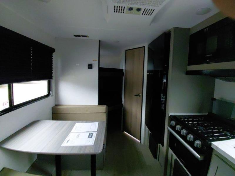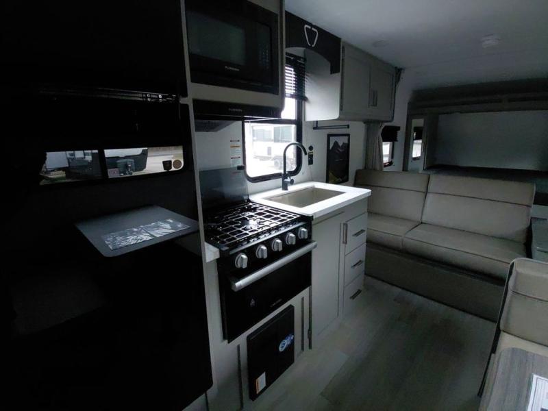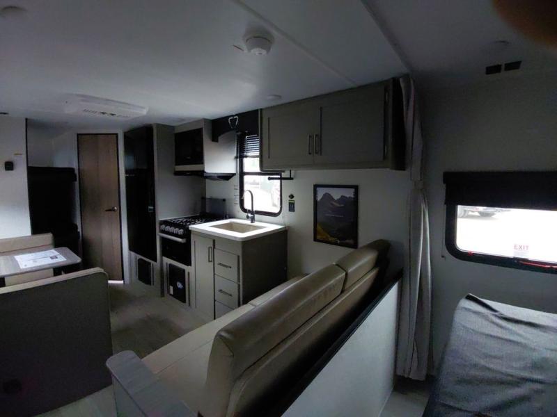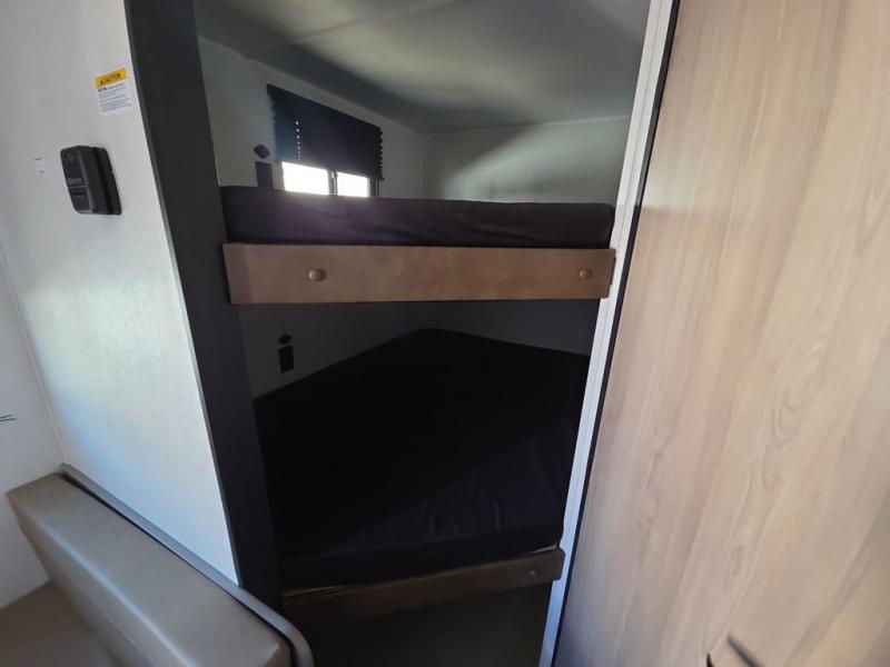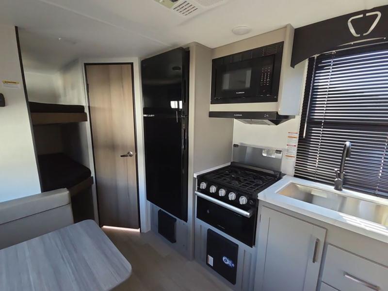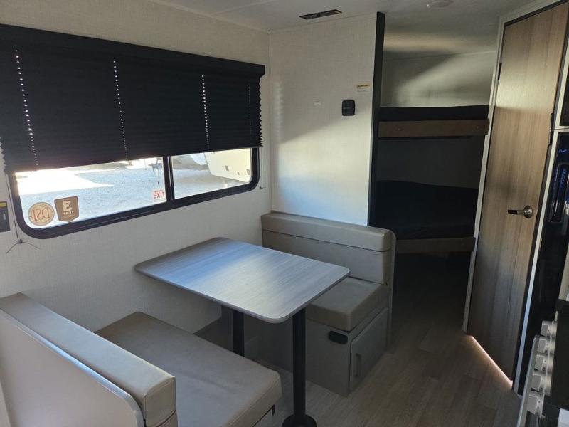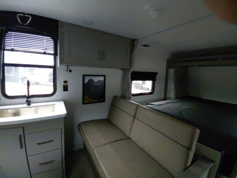 The whole gang will love camping in this travel trailer with double-size bunks! You'll enjoy your own Olympic RV queen bed up front in the semi-private bedroom, along with dual wardrobes to keep your things tidy. Once the chef of your group has made dinner on the three-burner cooktop, you can dine at the booth dinette or take your plate outdoors to sit under the 16' power awning with LED lights. There is also a sofa with an end table inside that will provide additional seating and sleeping space. And don't overlook the rear corner full bath adjacent to the bunks for easy nighttime use!
