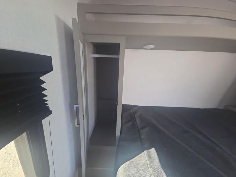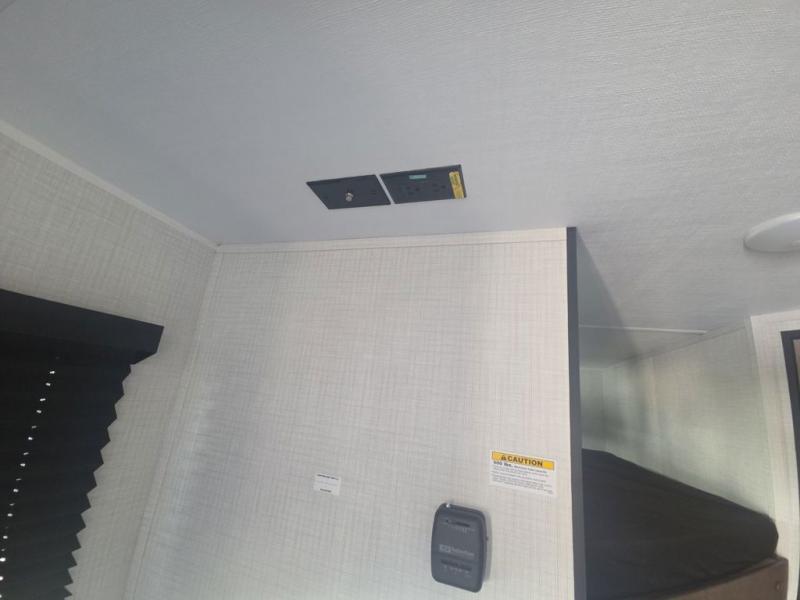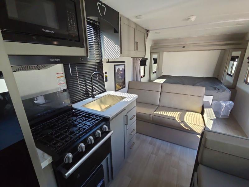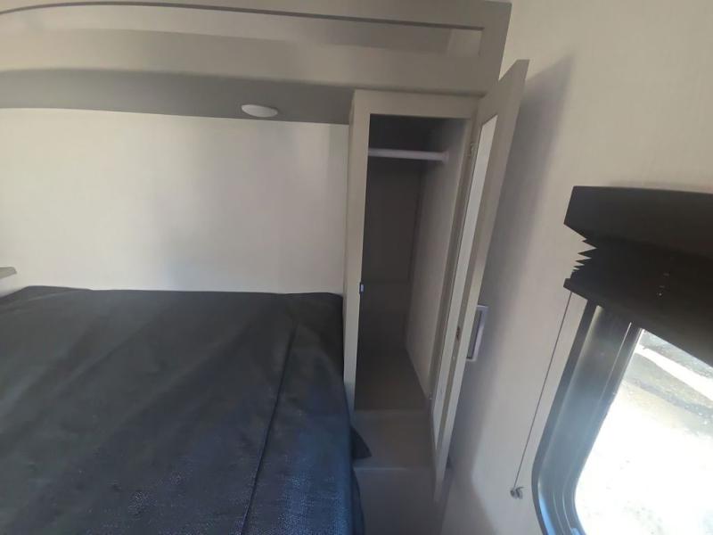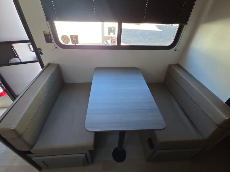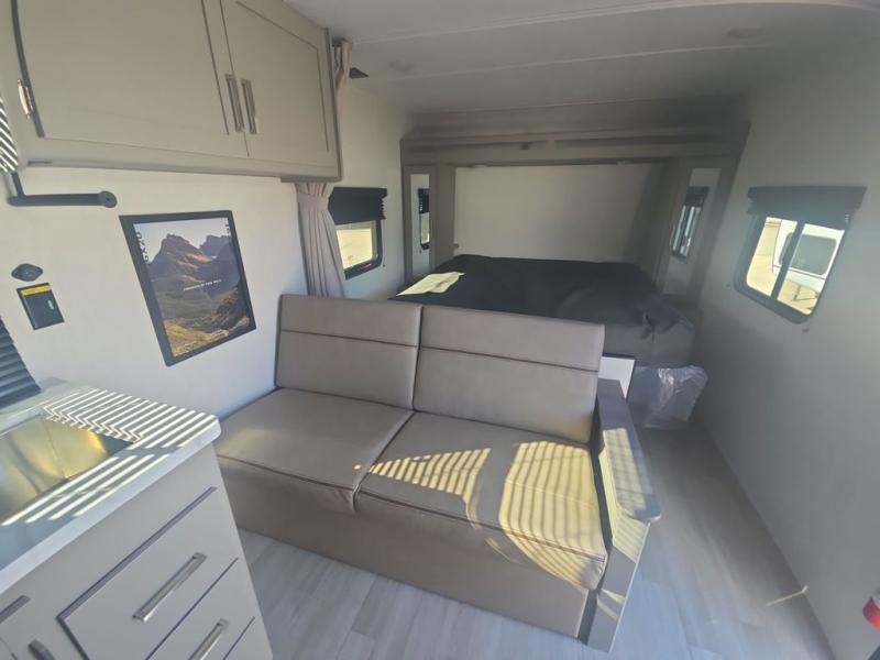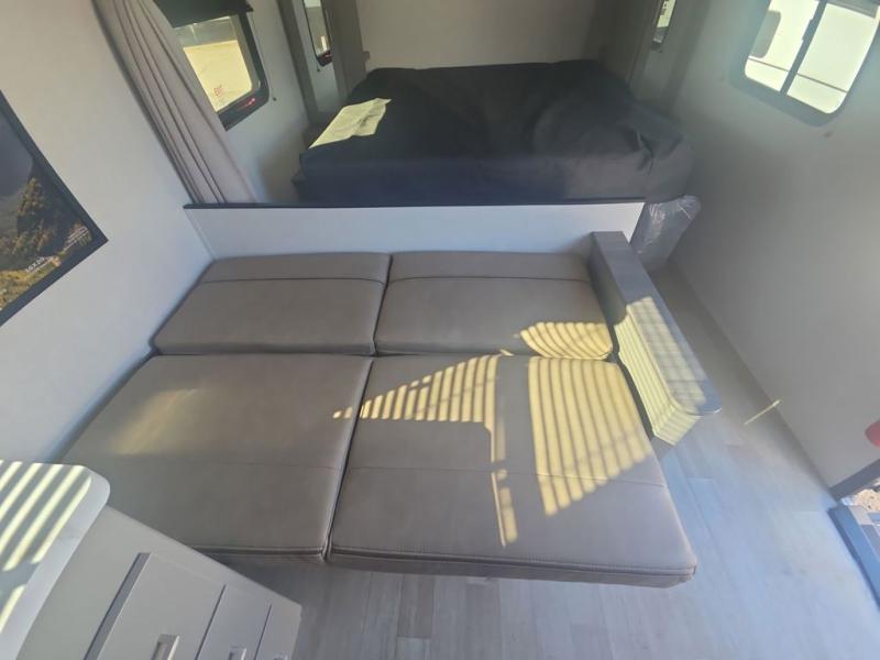 The whole gang will love camping in this travel trailer with double-size bunks! You'll enjoy your own Olympic RV queen bed up front in the semi-private bedroom, along with dual wardrobes to keep your things tidy. Once the chef of your group has made dinner on the three-burner cooktop, you can dine at the booth dinette or take your plate outdoors to sit under the 16' power awning with LED lights. There is also a sofa with an end table inside that will provide additional seating and sleeping space. And don't overlook the rear corner full bath adjacent to the bunks for easy nighttime use!