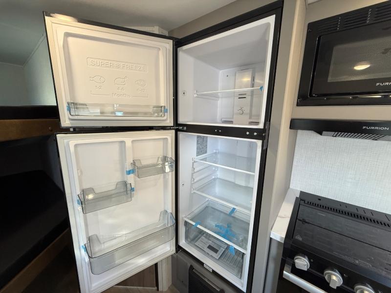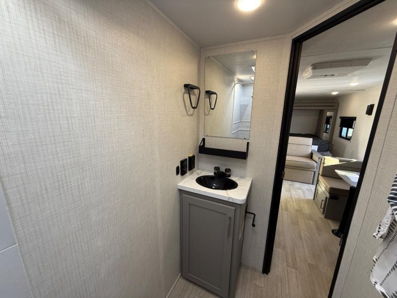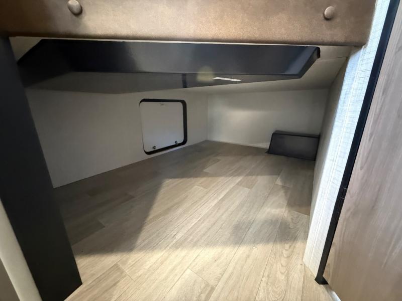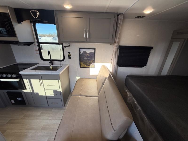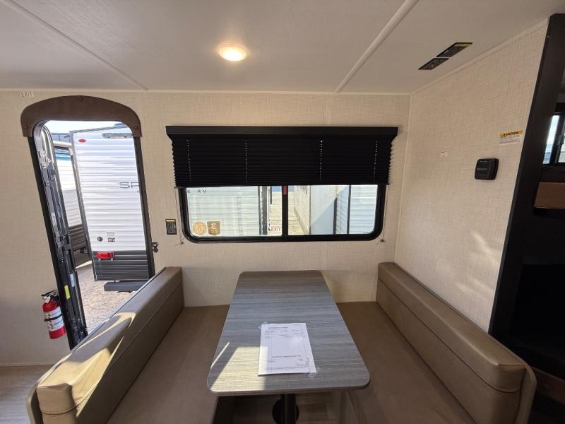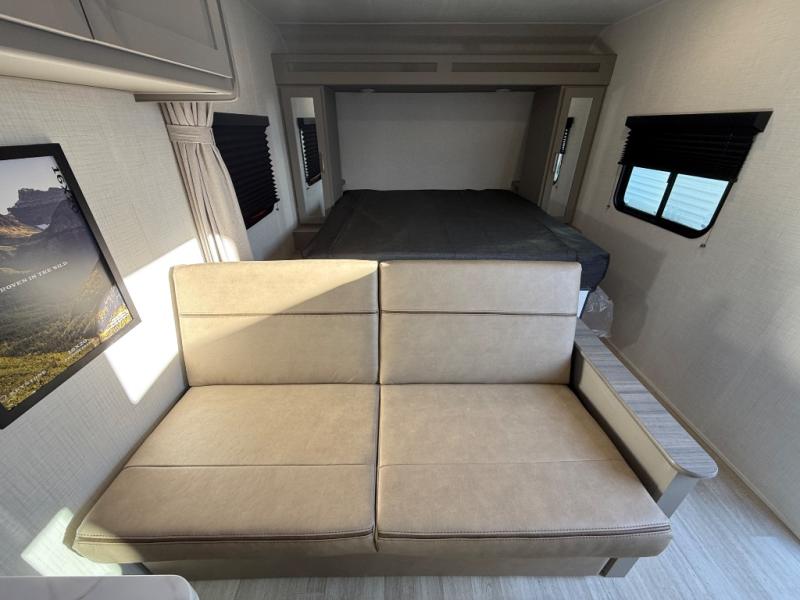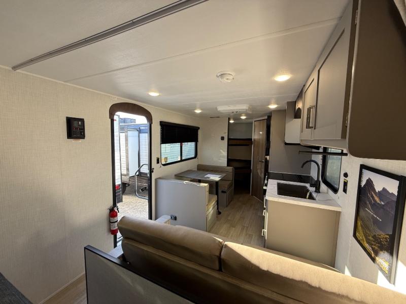 The whole gang will love camping in this travel trailer with double-size bunks! You'll enjoy your own Olympic RV queen bed up front in the semi-private bedroom, along with dual wardrobes to keep your things tidy. Once the chef of your group has made dinner on the three-burner cooktop, you can dine at the booth dinette or take your plate outdoors to sit under the 16' power awning with LED lights. There is also a sofa with an end table inside that will provide additional seating and sleeping space. And don't overlook the rear corner full bath adjacent to the bunks for easy nighttime use!