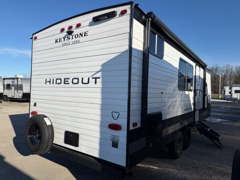 With any Hideout travel trailer by Keystone, you will find functional features and comfort at every turn! Each one is built with tinted safety glass windows and a walkable roof for added durability. There are also Solid Step entry steps outside, along with an outside shower, heavy-duty stabilizer jacks, a spare tire kit and Tire Linc TPMS prep. You'll love the pressed membrane premium countertops inside, plus a decorative tub surround, LED lighting, blackout night shades, and many more comforts. Additional features include a tankless water heater, a porcelain foot flush toilet, a power tongue jack, and an XL entry assist handle to name just a few!