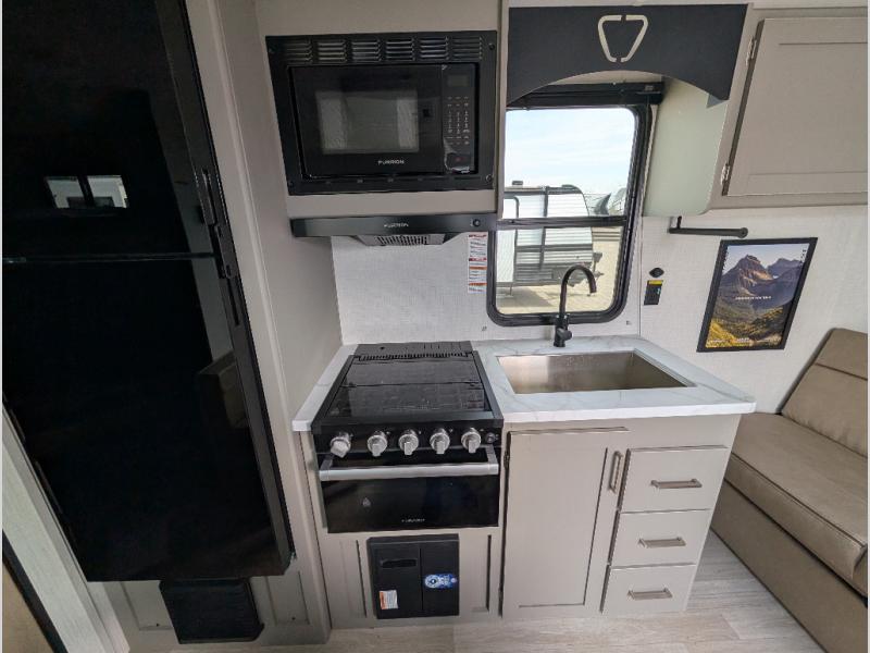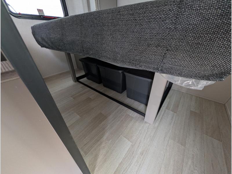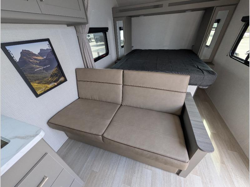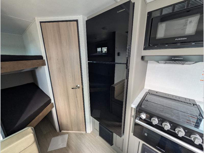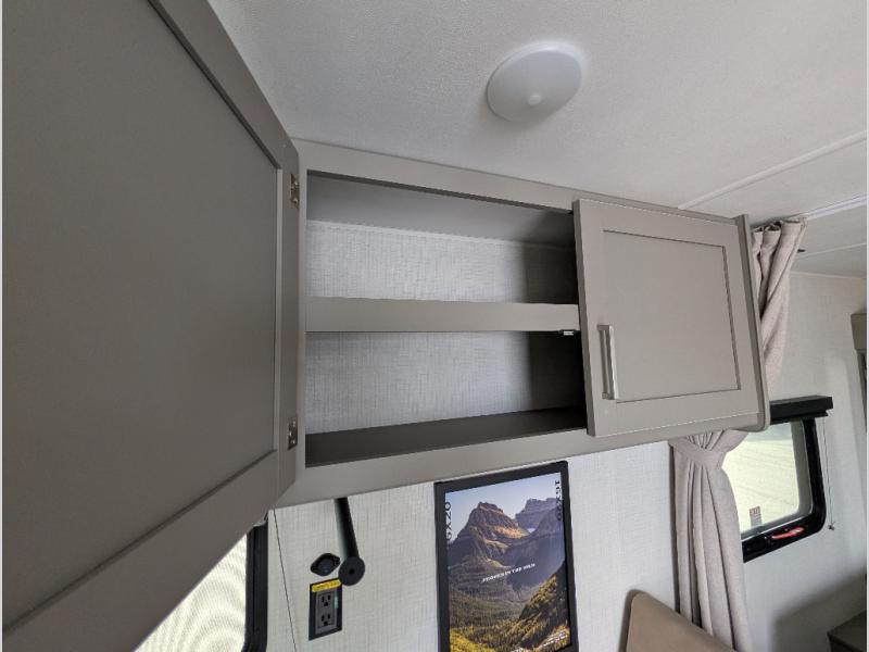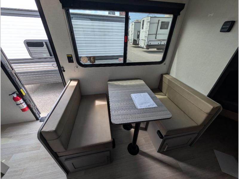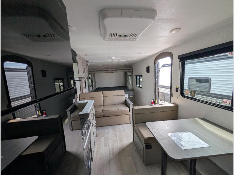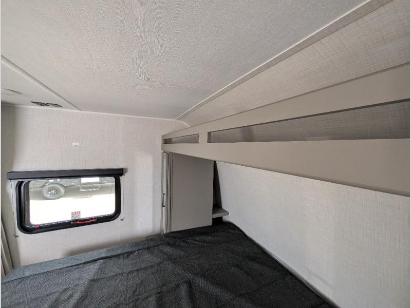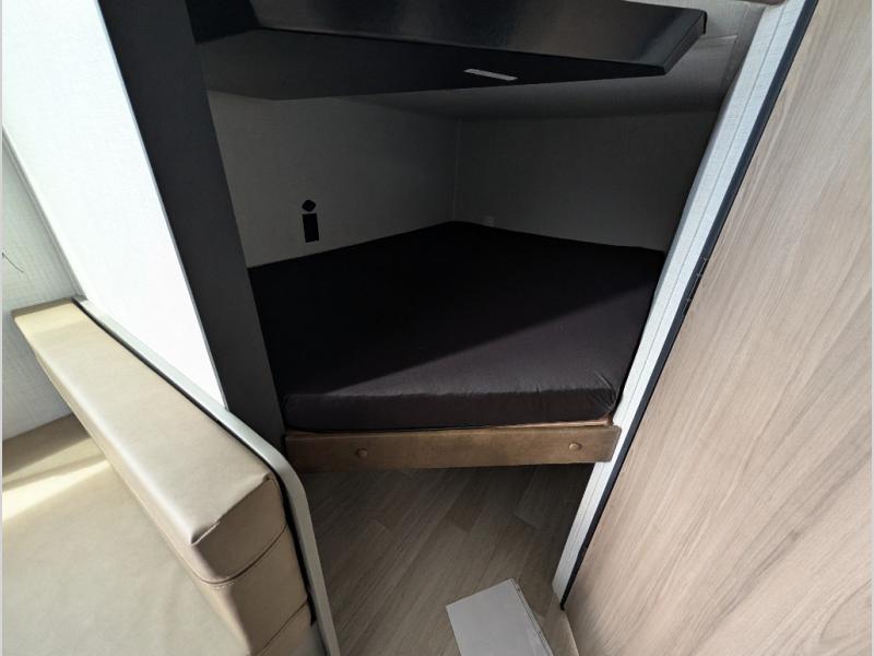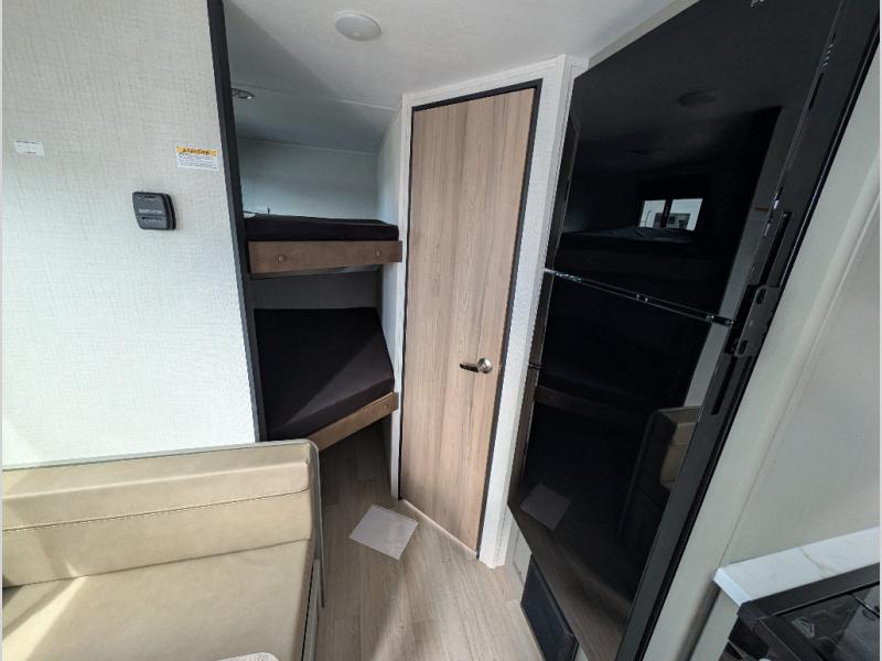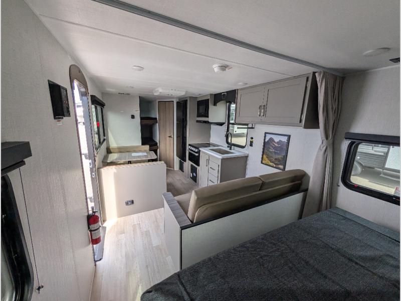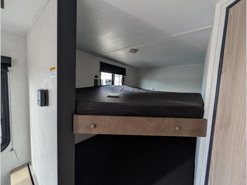 The whole gang will love camping in this travel trailer with double-size bunks! You'll enjoy your own Olympic RV queen bed up front in the semi-private bedroom, along with dual wardrobes to keep your things tidy. Once the chef of your group has made dinner on the three-burner cooktop, you can dine at the booth dinette or take your plate outdoors to sit under the 16' power awning with LED lights. There is also a sofa with an end table inside that will provide additional seating and sleeping space. And don't overlook the rear corner full bath adjacent to the bunks for easy nighttime use!