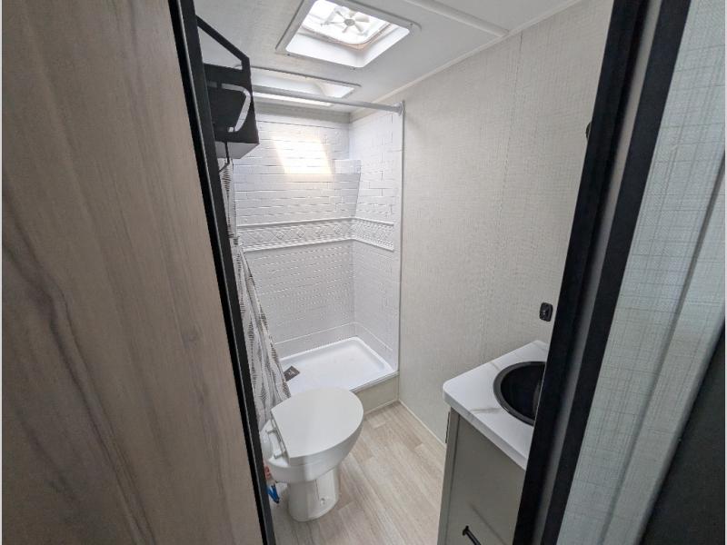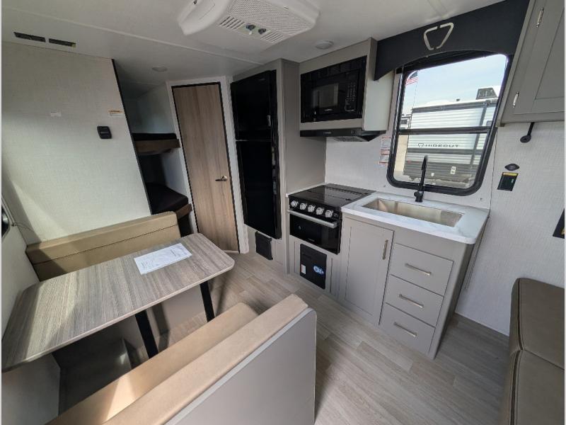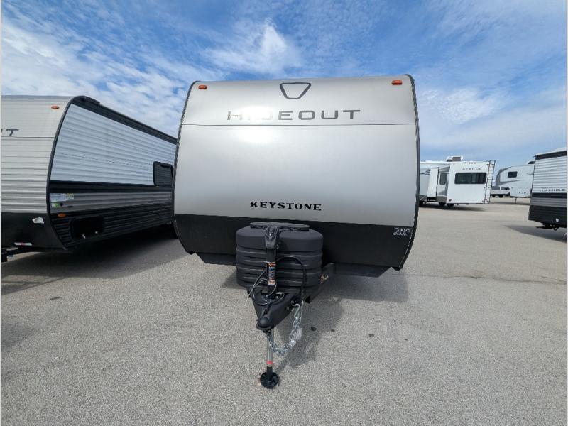 With any Hideout travel trailer by Keystone, you will find functional features and comfort at every turn! Each one is built with tinted safety glass windows and a walkable roof for added durability. There are also Solid Step entry steps outside, along with an outside shower, heavy-duty stabilizer jacks, a spare tire kit and Tire Linc TPMS prep. You'll love the pressed membrane premium countertops inside, plus a decorative tub surround, LED lighting, blackout night shades, and many more comforts. Additional features include a tankless water heater, a porcelain foot flush toilet, a power tongue jack, and an XL entry assist handle to name just a few!