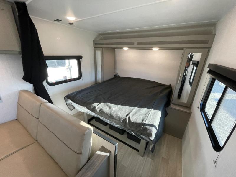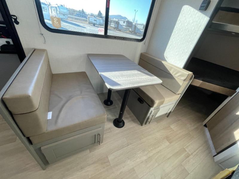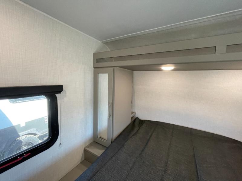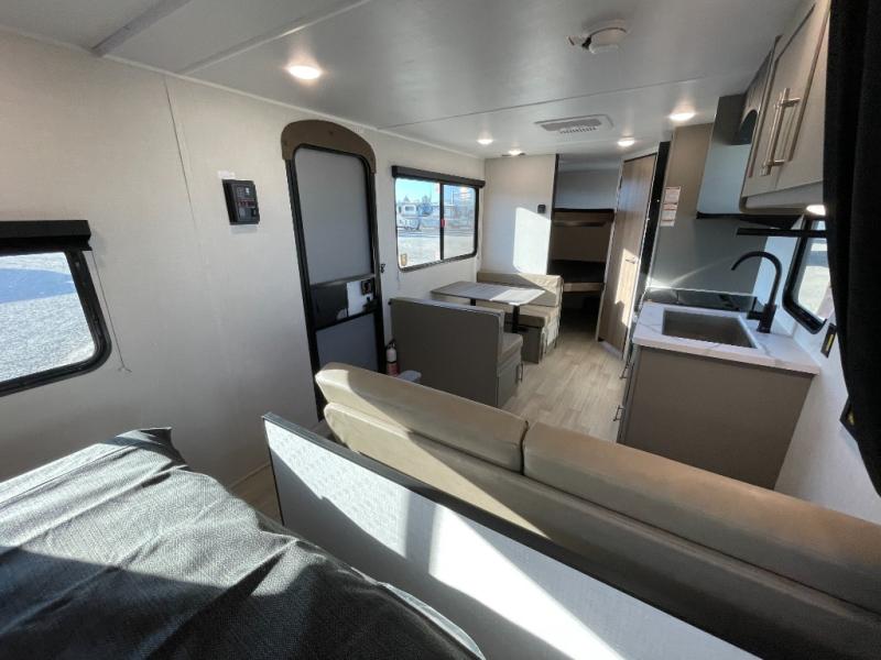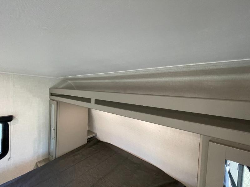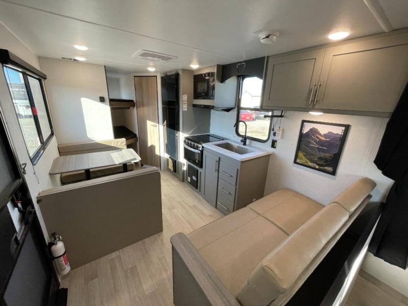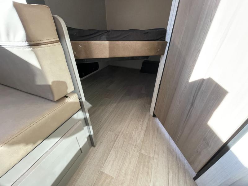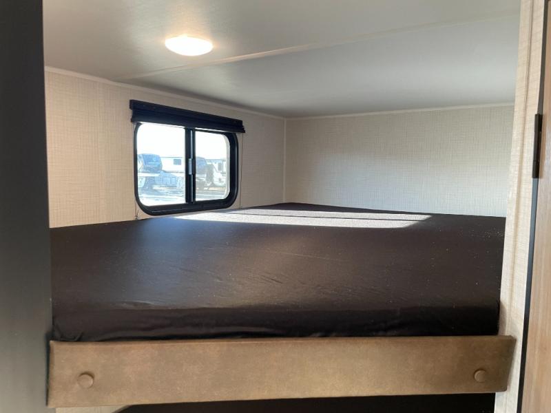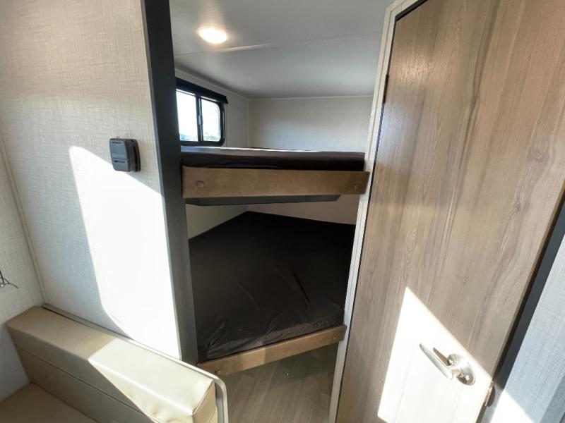 The whole gang will love camping in this travel trailer with double-size bunks! You'll enjoy your own Olympic RV queen bed up front in the semi-private bedroom, along with dual wardrobes to keep your things tidy. Once the chef of your group has made dinner on the three-burner cooktop, you can dine at the booth dinette or take your plate outdoors to sit under the 16' power awning with LED lights. There is also a sofa with an end table inside that will provide additional seating and sleeping space. And don't overlook the rear corner full bath adjacent to the bunks for easy nighttime use!