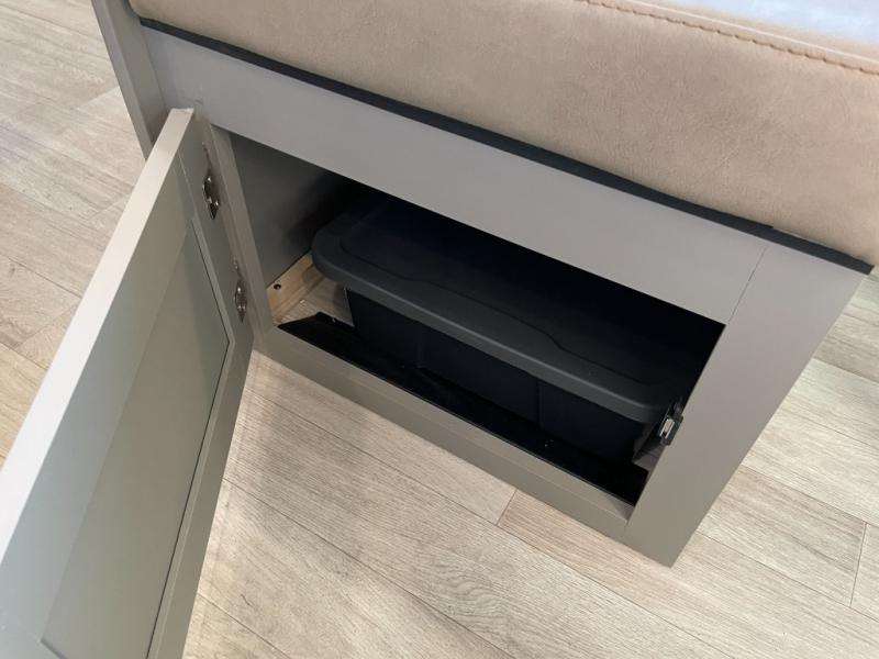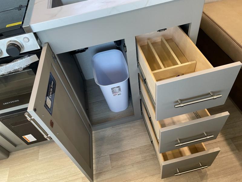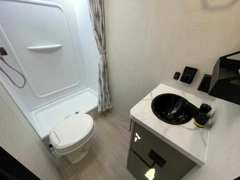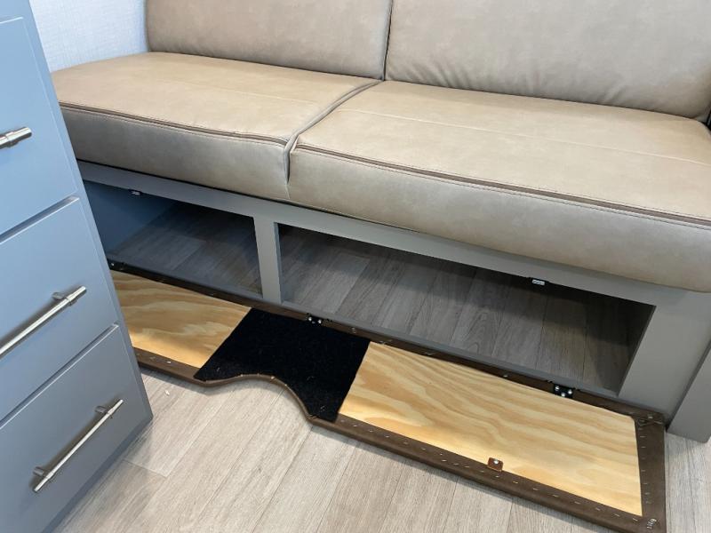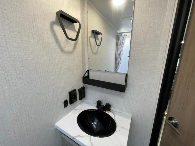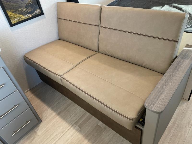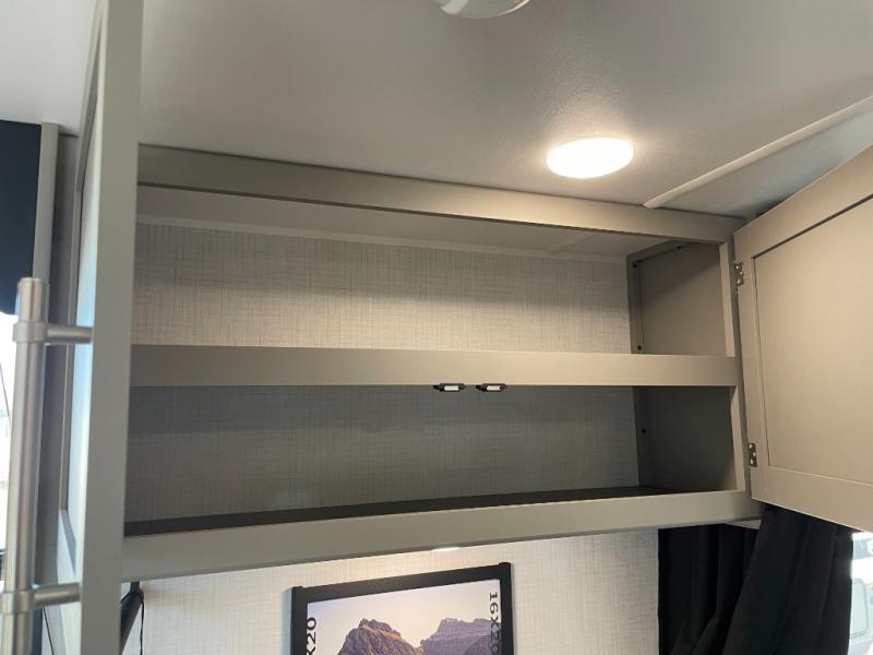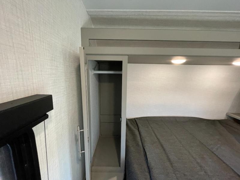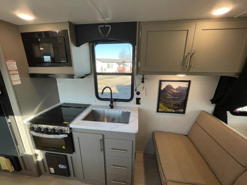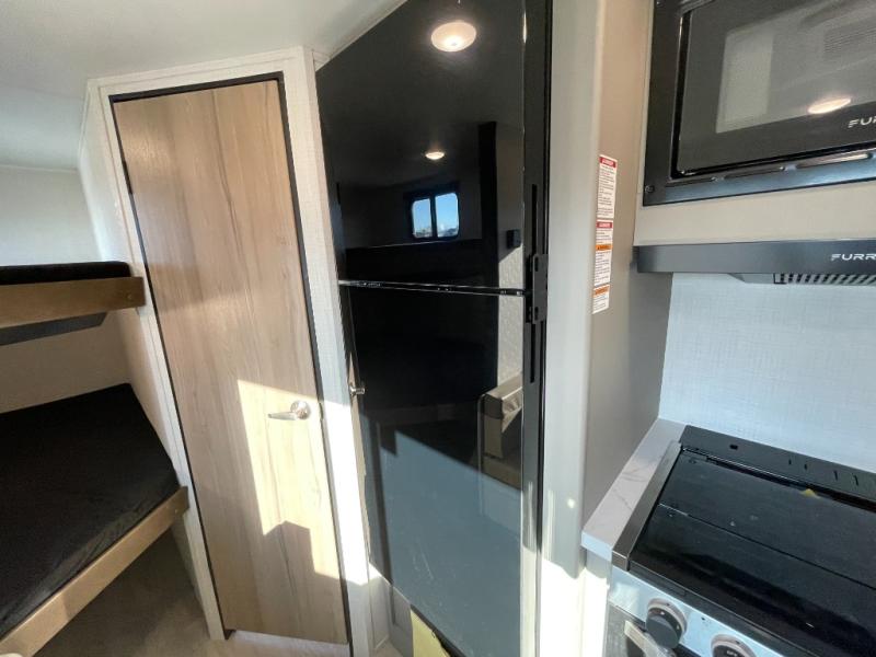 The whole gang will love camping in this travel trailer with double-size bunks! You'll enjoy your own Olympic RV queen bed up front in the semi-private bedroom, along with dual wardrobes to keep your things tidy. Once the chef of your group has made dinner on the three-burner cooktop, you can dine at the booth dinette or take your plate outdoors to sit under the 16' power awning with LED lights. There is also a sofa with an end table inside that will provide additional seating and sleeping space. And don't overlook the rear corner full bath adjacent to the bunks for easy nighttime use!