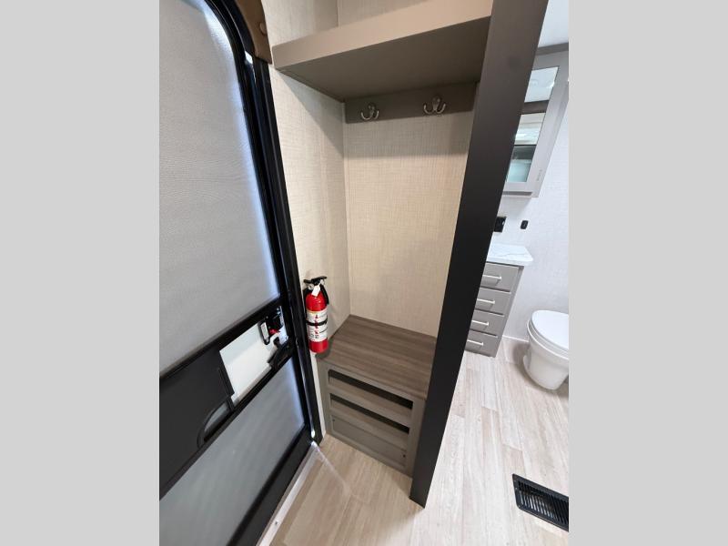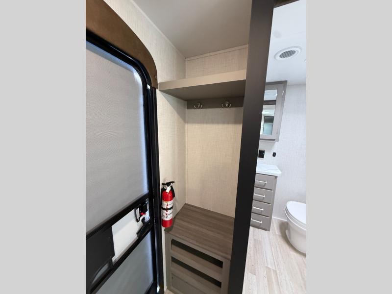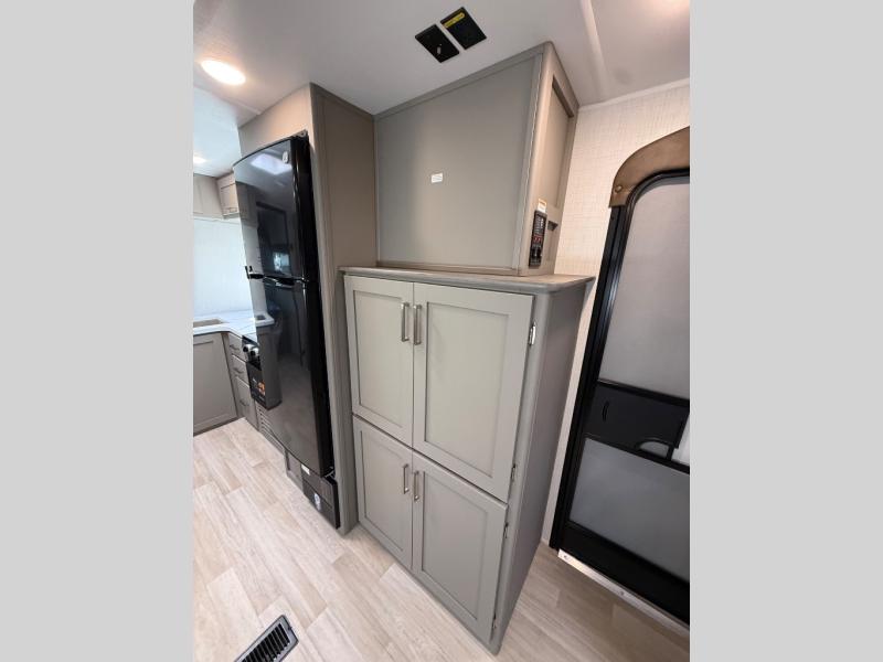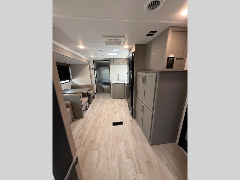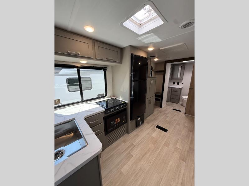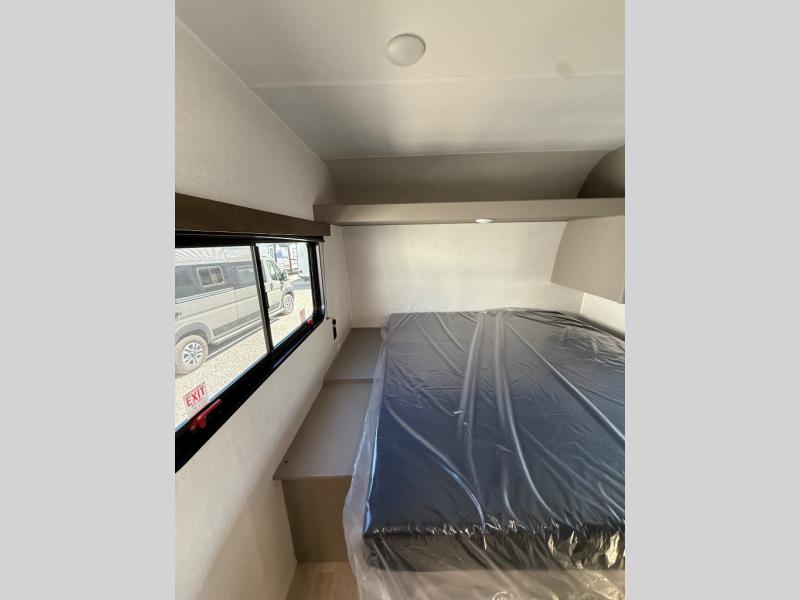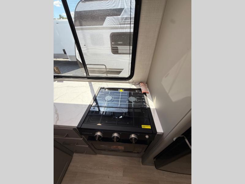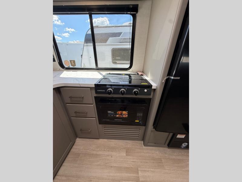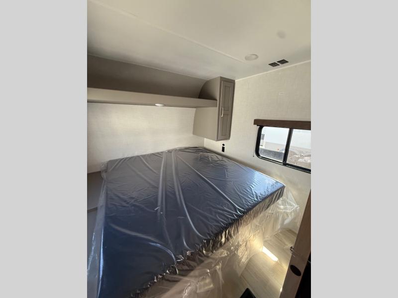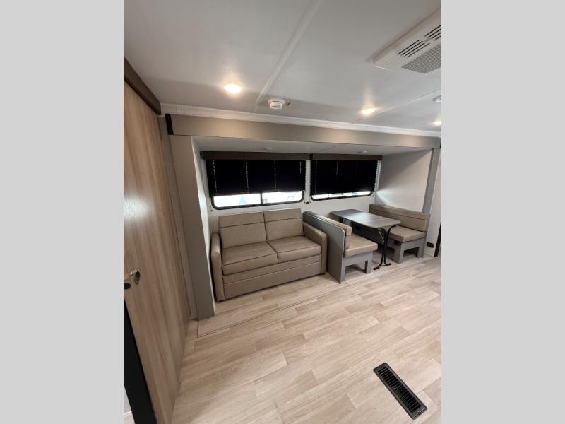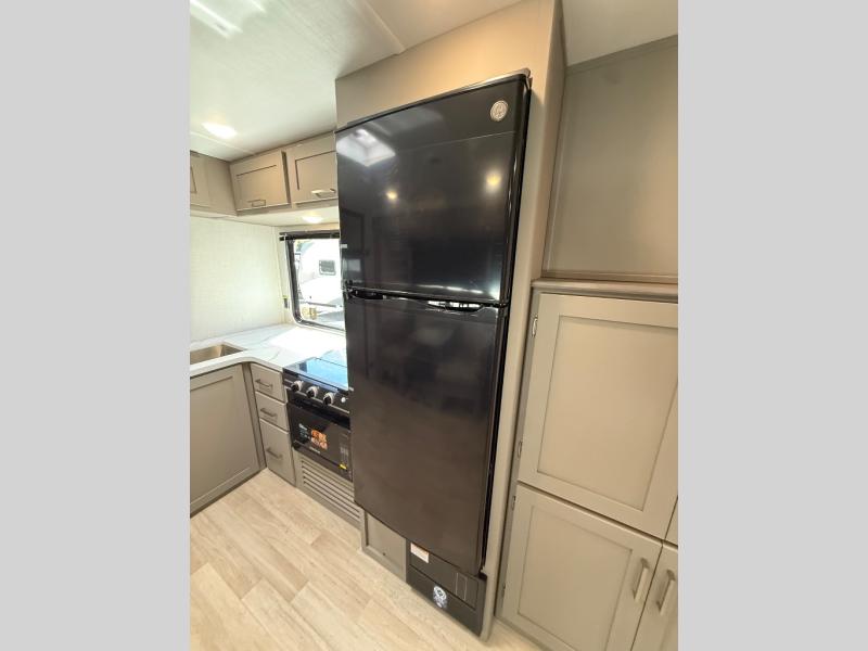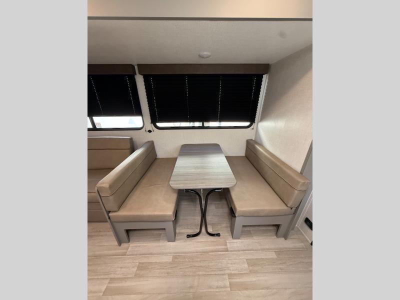 You'll feel right at home wherever you decide to camp in this travel trailer. The large slide out in the combined kitchen and living area gives your crew plenty of space to move about, plus there is a booth dinette and sofa for comfy seating and sleeping spaces. A full kitchen, compete with three burner cooktop and 10 cu. ft. 12V refrigerator will let you cook and store food for the whole week. Head to the full rear bath that includes a spacious vanity, a shower, toilet, and linen closet for clean towels. And when you're ready to catch some zzz's, the queen bed in the front private bedroom is sure to bring comfort!