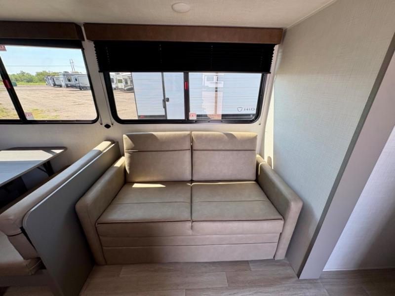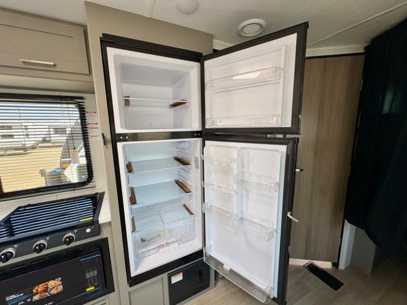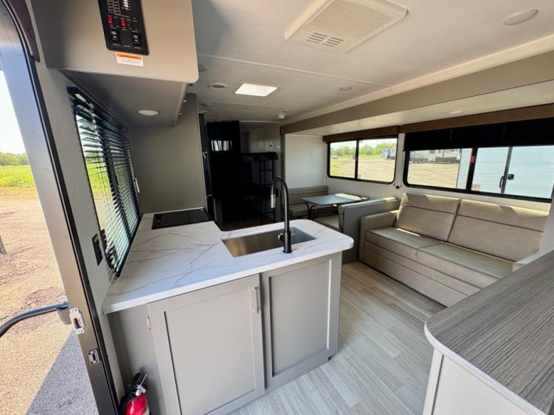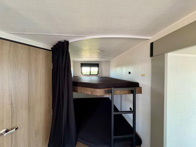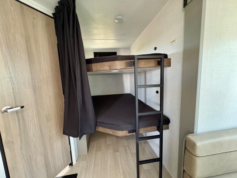 Pack your bags and head for the lake or woods in this spacious trailer! You can comfortably sleep nine to ten with the double-size bunks and the queen bed in the front private bedroom, plus the booth dinette and sofa in the main living area. There is even TV prep here if you want to add a television to the entertainment center for movie nights. The kitchen includes a 10 cu. ft. 12V refrigerator and an extra large pantry for food storage, plus a cooktop to prepare meals each day. The full bath included will let you clean up after a day of exploring outdoors, and you'll find the second entry door here for convenience!