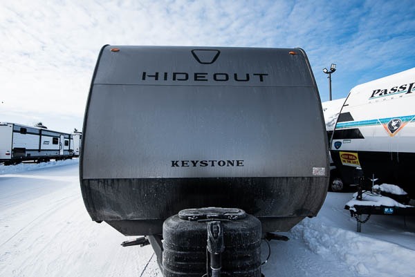 With any Hideout travel trailer by Keystone, you will find functional features and comfort at every turn! Each one is built with tinted safety glass windows and a walkable roof for added durability. There are also Solid Step entry steps outside, along with an outside shower, heavy-duty stabilizer jacks, a spare tire kit and Tire Linc TPMS prep. You'll love the pressed membrane premium countertops inside, plus a decorative tub surround, LED lighting, blackout night shades, and many more comforts. Additional features include a tankless water heater, a porcelain foot flush toilet, a power tongue jack, and an XL entry assist handle to name just a few!