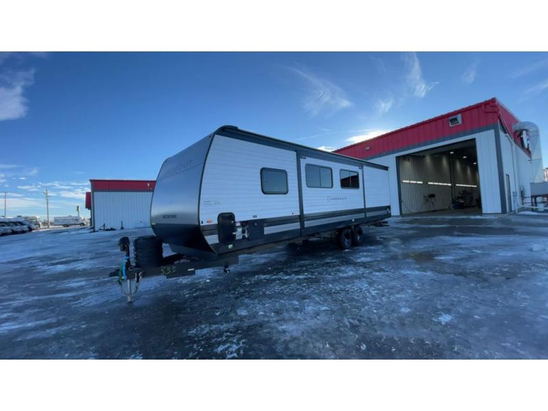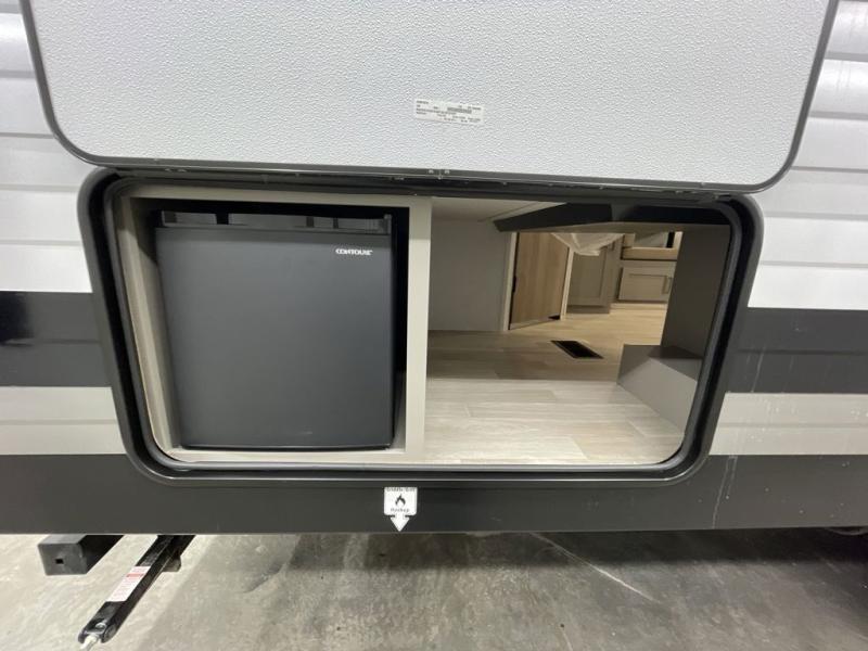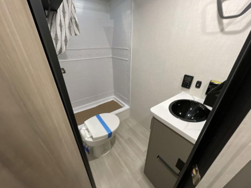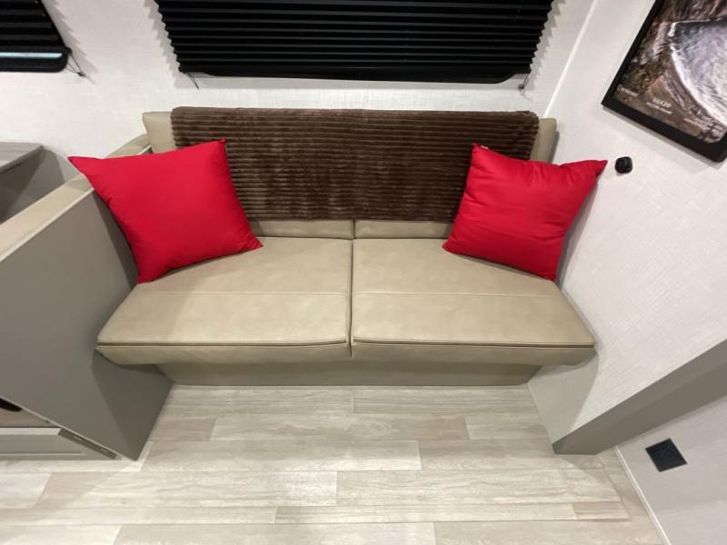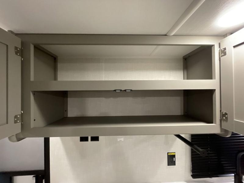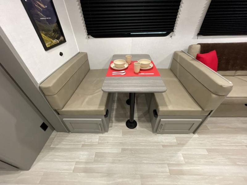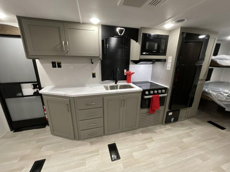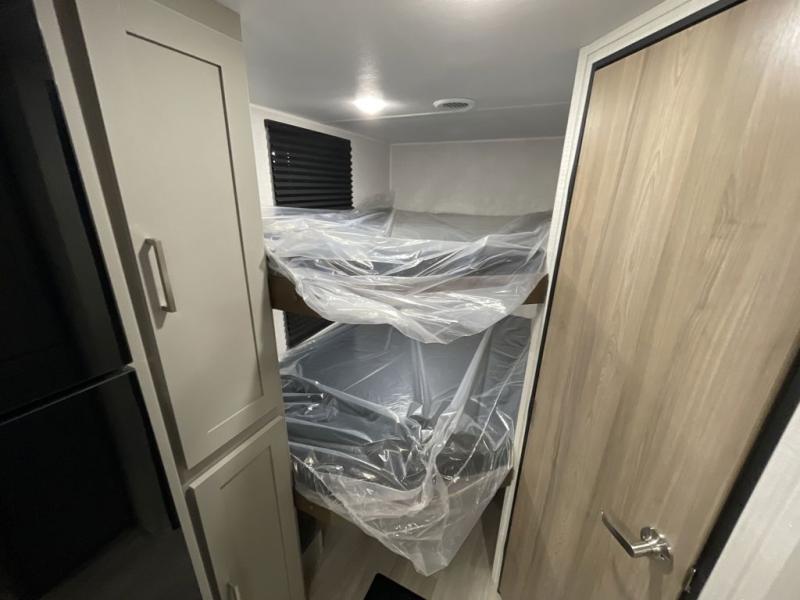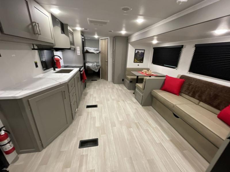 Pack your bags and head to your favorite camping spot in this travel trailer for eight! Your guests or little ones are sure to enjoy the double-size bunks, which are adjacent to the full bath for easy access at night. The large slide out creates a spacious living area and kitchen, giving the chef ample room to cook on the three-burner cooktop. There is a booth dinette and sofa within the slide that will provide space to relax, dine, and even convert to additional sleeping space. You'll find your own space up front in the private bedroom, complete with a walk-around Olympic RV queen bed, dual wardrobes and an overhead shelf for books!