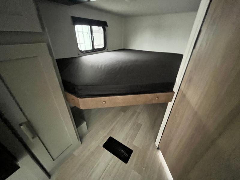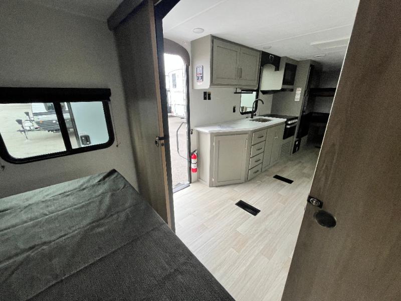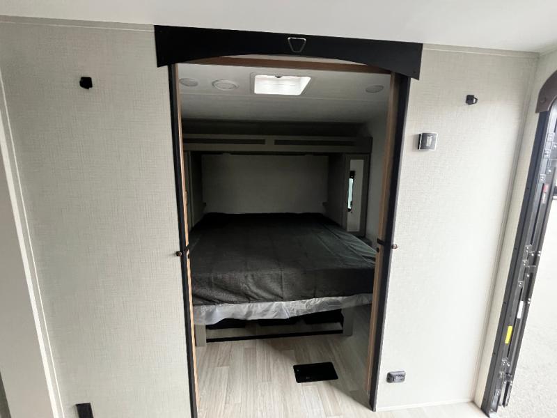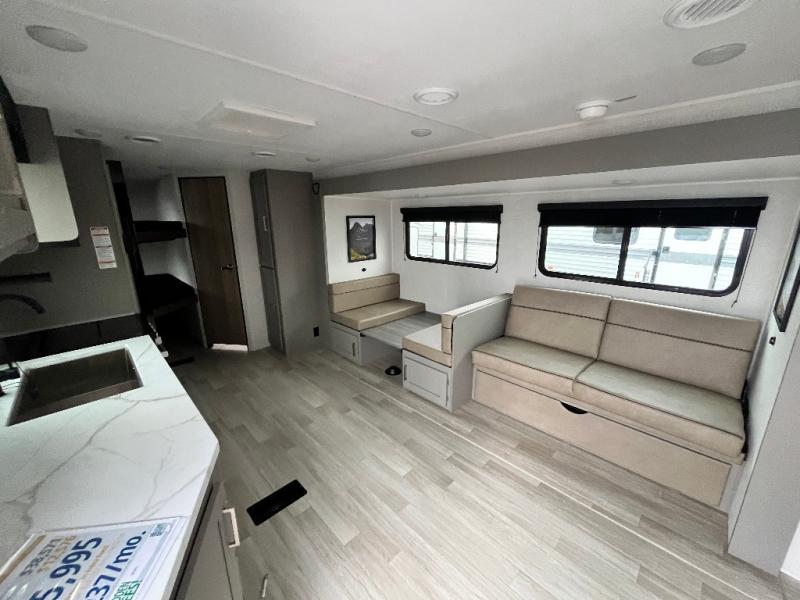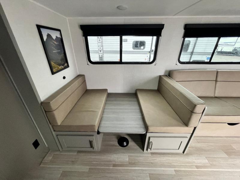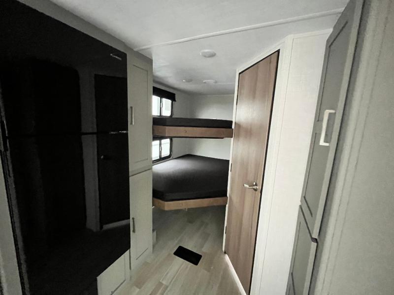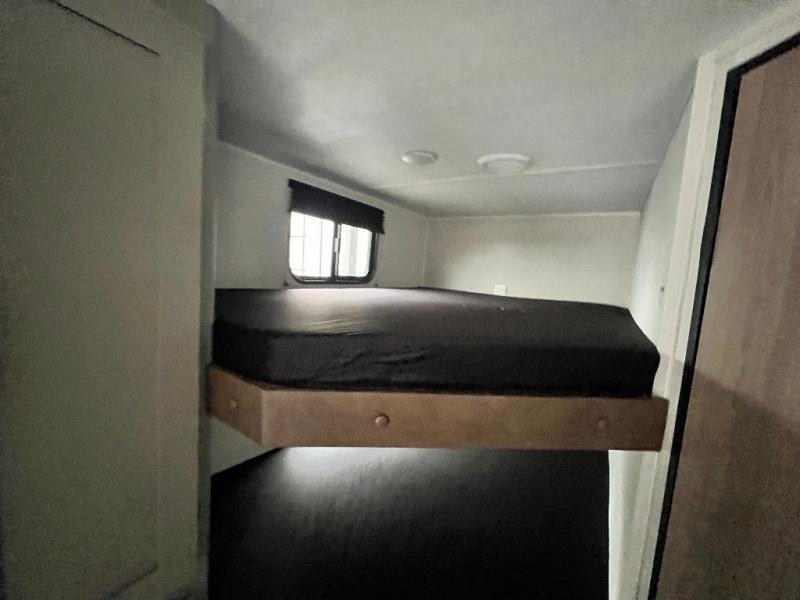Pack your bags and head to your favorite camping spot in this travel trailer for eight! Your guests or little ones are sure to enjoy the double-size bunks, which are adjacent to the full bath for easy access at night. The large slide out creates a spacious living area and kitchen, giving the chef ample room to cook on the three-burner cooktop. There is a booth dinette and sofa within the slide that will provide space to relax, dine, and even convert to additional sleeping space. You'll find your own space up front in the private bedroom, complete with a walk-around Olympic RV queen bed, dual wardrobes and an overhead shelf for books!