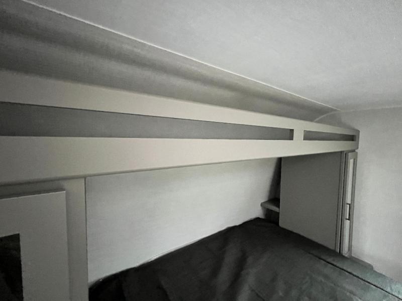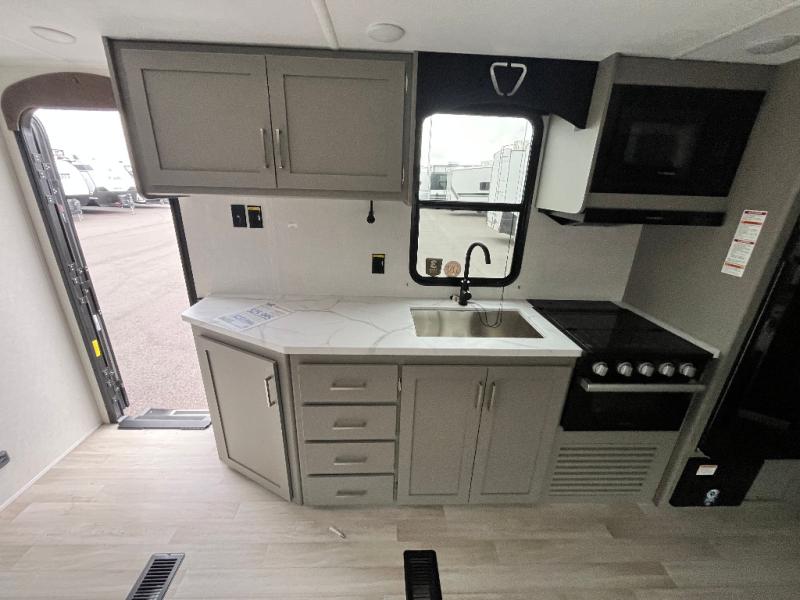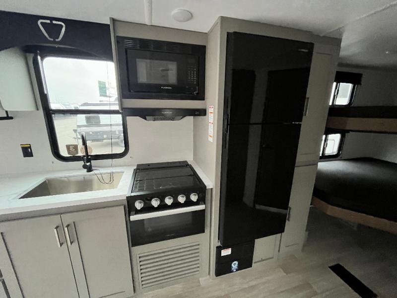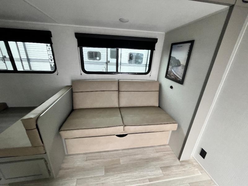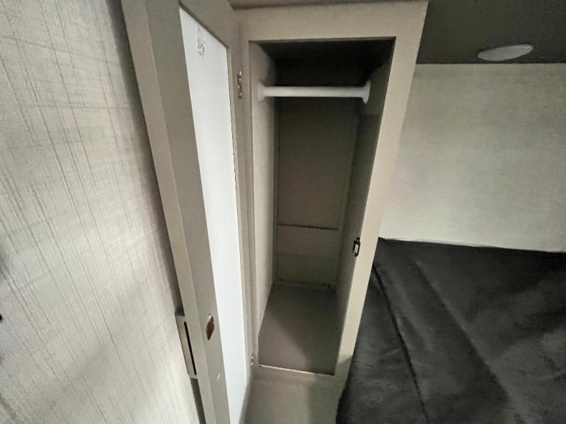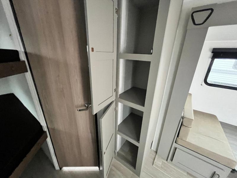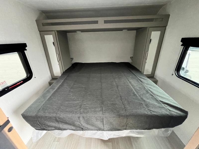 Pack your bags and head to your favorite camping spot in this travel trailer for eight! Your guests or little ones are sure to enjoy the double-size bunks, which are adjacent to the full bath for easy access at night. The large slide out creates a spacious living area and kitchen, giving the chef ample room to cook on the three-burner cooktop. There is a booth dinette and sofa within the slide that will provide space to relax, dine, and even convert to additional sleeping space. You'll find your own space up front in the private bedroom, complete with a walk-around Olympic RV queen bed, dual wardrobes and an overhead shelf for books!