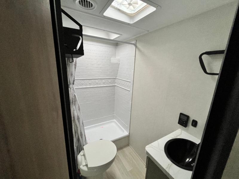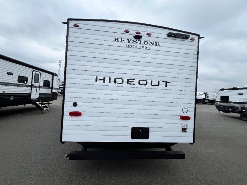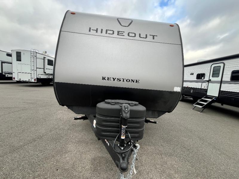 With any Hideout travel trailer by Keystone, you will find functional features and comfort at every turn! Each one is built with tinted safety glass windows and a walkable roof for added durability. There are also Solid Step entry steps outside, along with an outside shower, heavy-duty stabilizer jacks, a spare tire kit and Tire Linc TPMS prep. You'll love the pressed membrane premium countertops inside, plus a decorative tub surround, LED lighting, blackout night shades, and many more comforts. Additional features include a tankless water heater, a porcelain foot flush toilet, a power tongue jack, and an XL entry assist handle to name just a few!