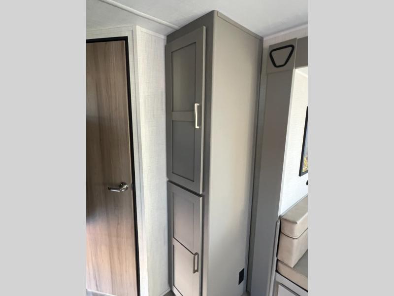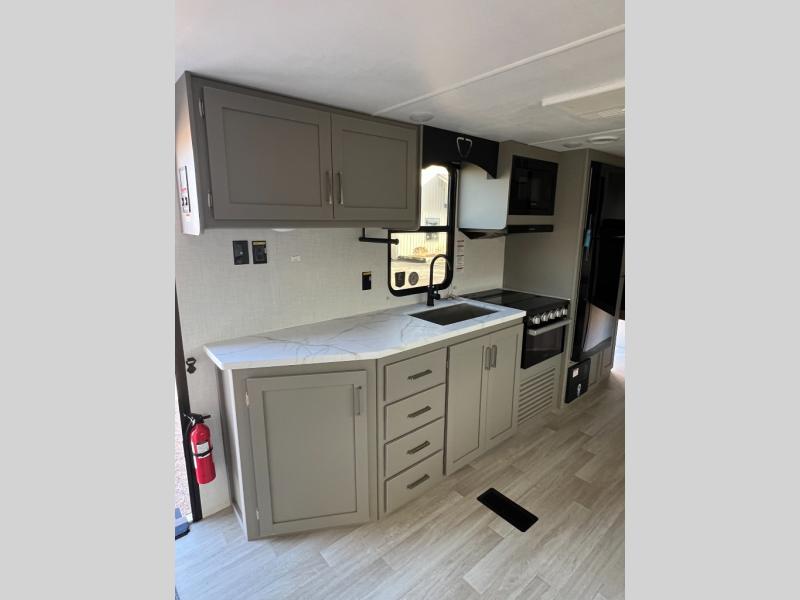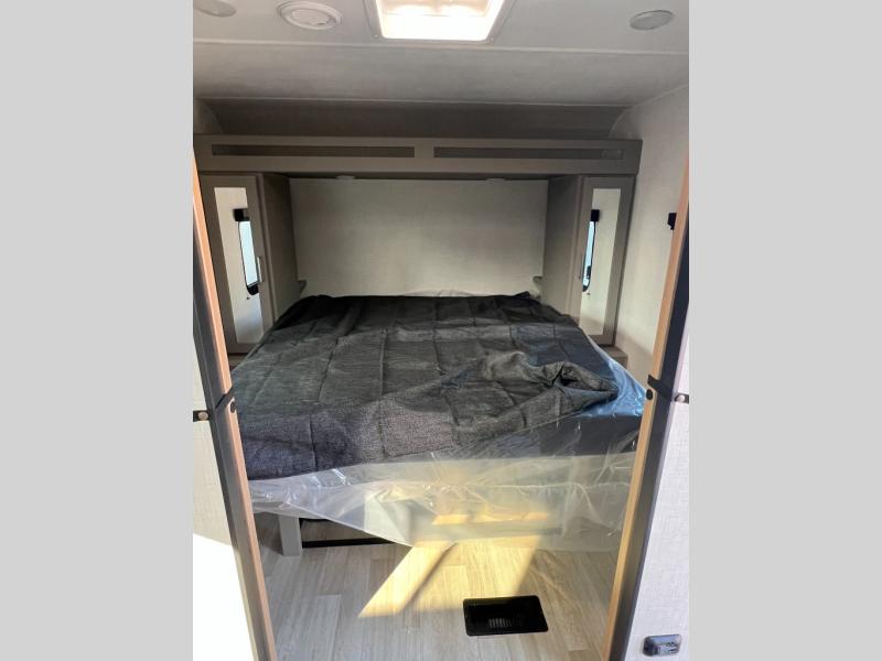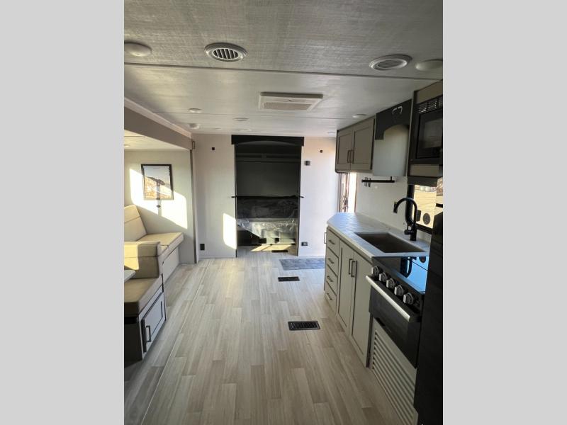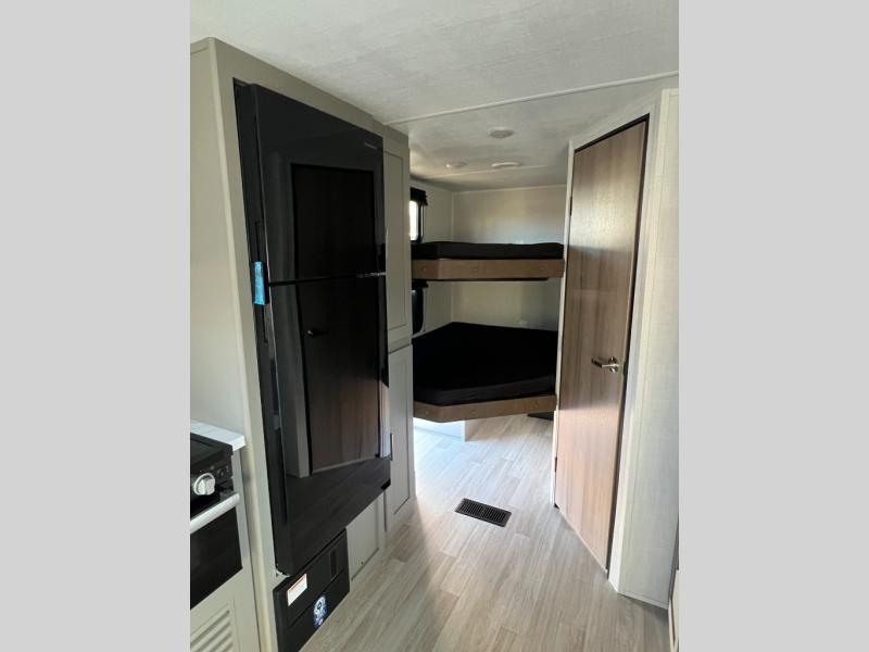 Pack your bags and head to your favorite camping spot in this travel trailer for eight! Your guests or little ones are sure to enjoy the double-size bunks, which are adjacent to the full bath for easy access at night. The large slide out creates a spacious living area and kitchen, giving the chef ample room to cook on the three-burner cooktop. There is a booth dinette and sofa within the slide that will provide space to relax, dine, and even convert to additional sleeping space. You'll find your own space up front in the private bedroom, complete with a walk-around Olympic RV queen bed, dual wardrobes and an overhead shelf for books!
